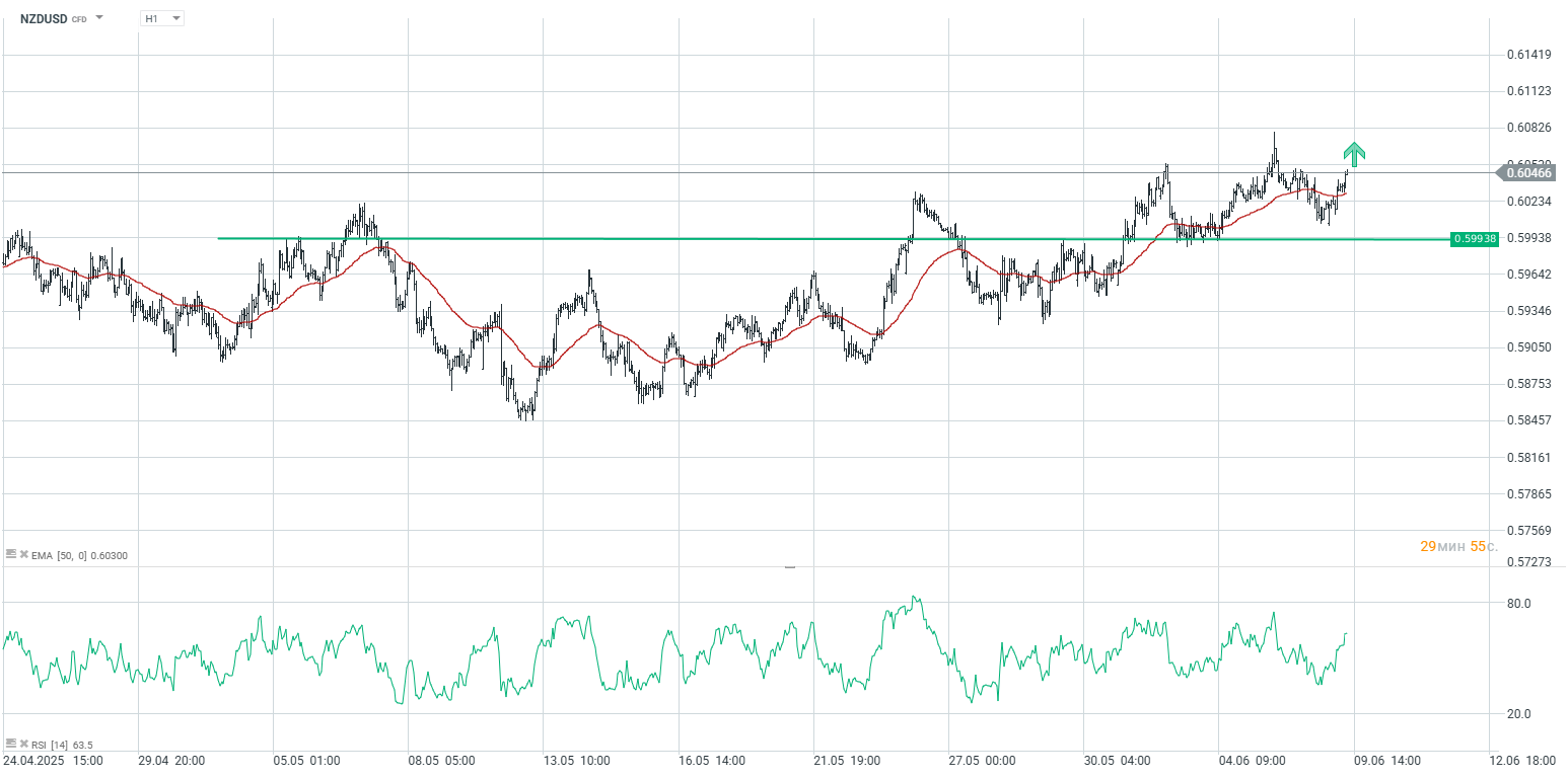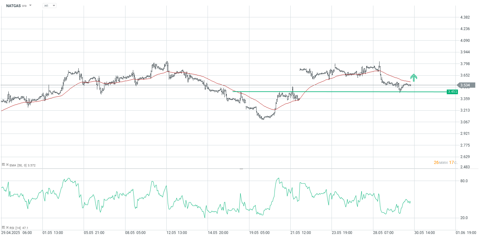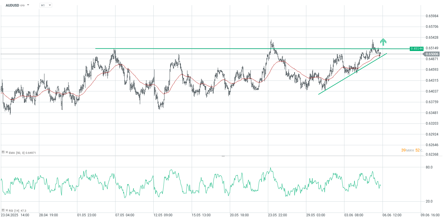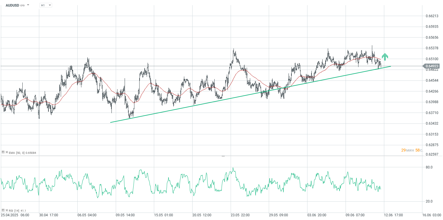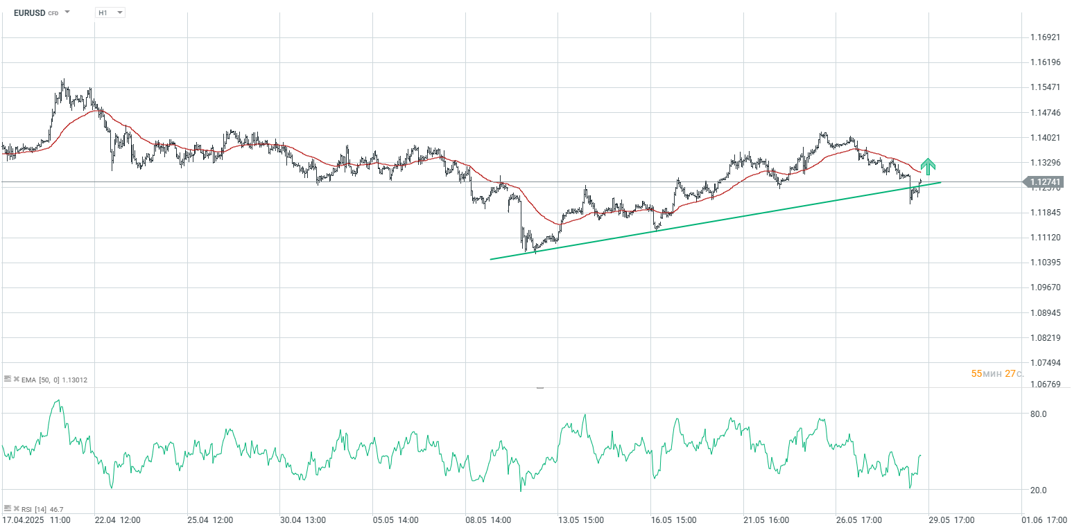 Індекс SP500 (US500) зупинив зростання біля похилої лінії опору. Це вказує на наявність параметрів для продовження корекції вниз. Індикатор RSI зреагував