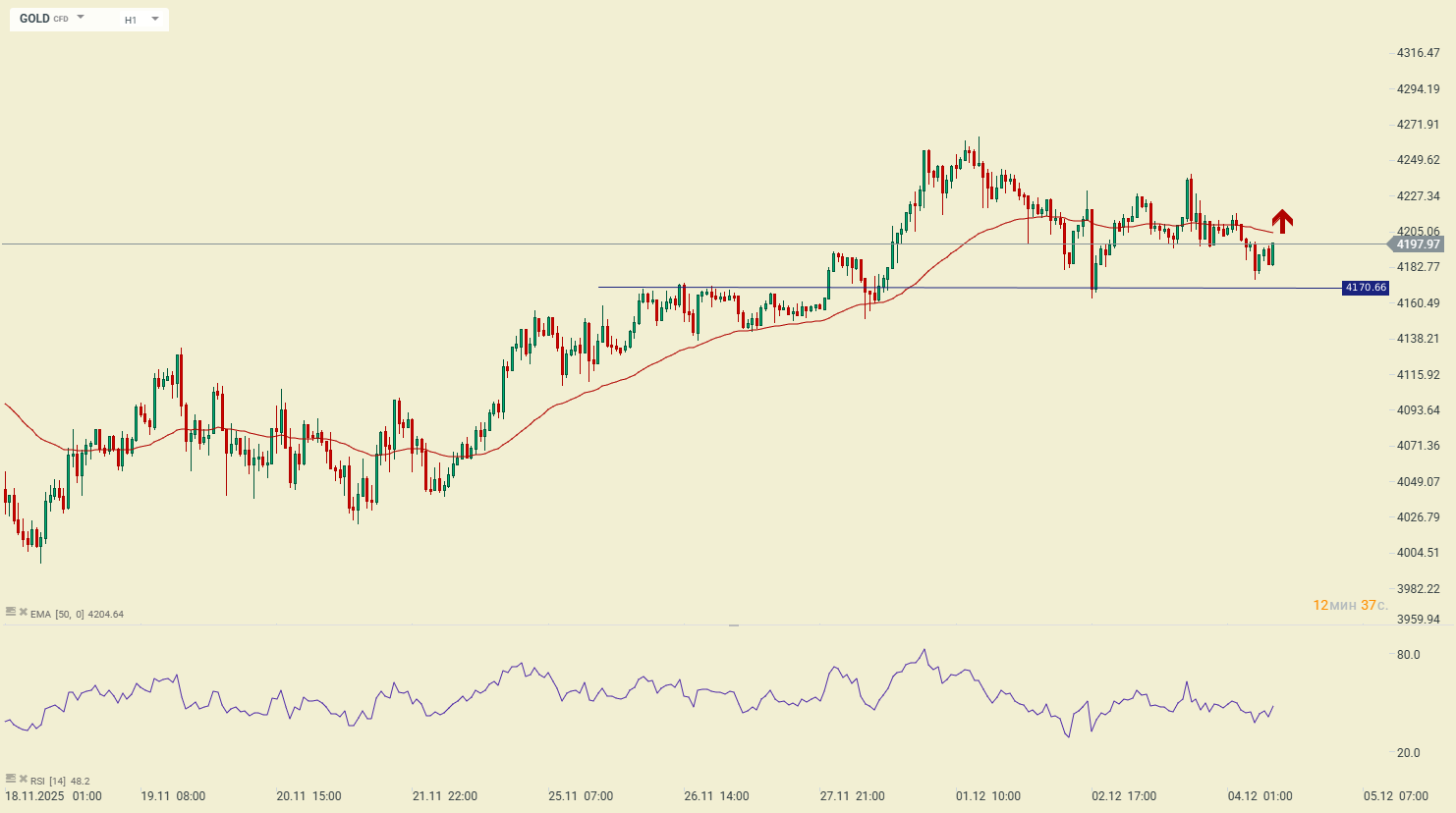 Золото GOLD продовжує набирати позицію для руху в бік довгострокової висхідної тенденції. Корекційне зниження до дзеркальної підтримки в районі 4170, втримання