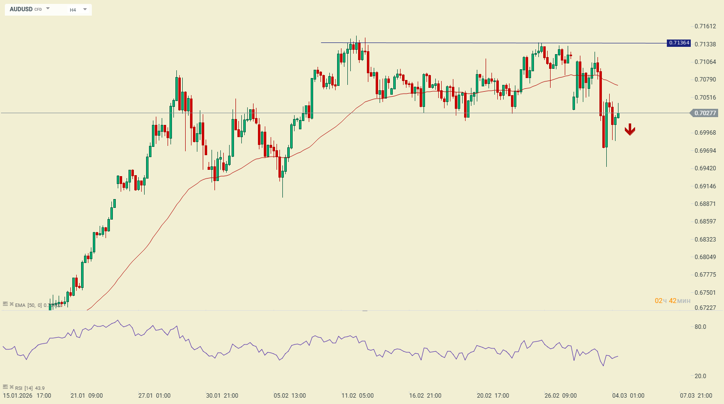 Валютна пара AUDUSD відреагувала на максимуми лютого і вчора показала рух вниз, в рамках якого зараз відбувається накопичення позиції. Це вказує