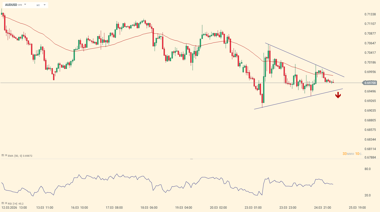 На валютній парі AUDUSD відбулася реакція на ключовий рівень підтримки в районі 0.6975 (зона корекції після трендового зростання). Ціна закріпилася