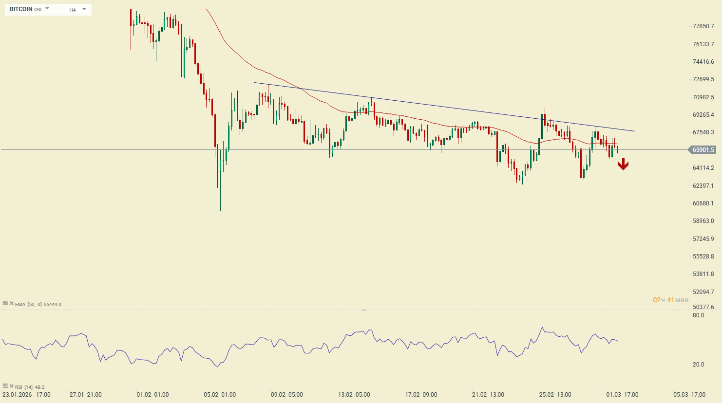 Вихід вниз із фігури технічного аналізу «трикутник» означає перспективу зниження по Біткоїну. Розглядаємо продовження падіння як мінімум в район 60К, при