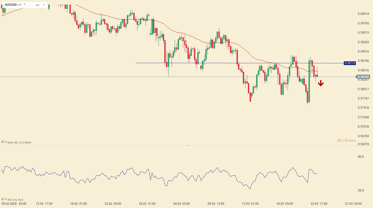 Після руху вниз валютна пара NZDUSD продовжує консолідуватися на своїх локальних мінімумах та втримує найближчий дзеркальний рівень опору. Реакція на опір