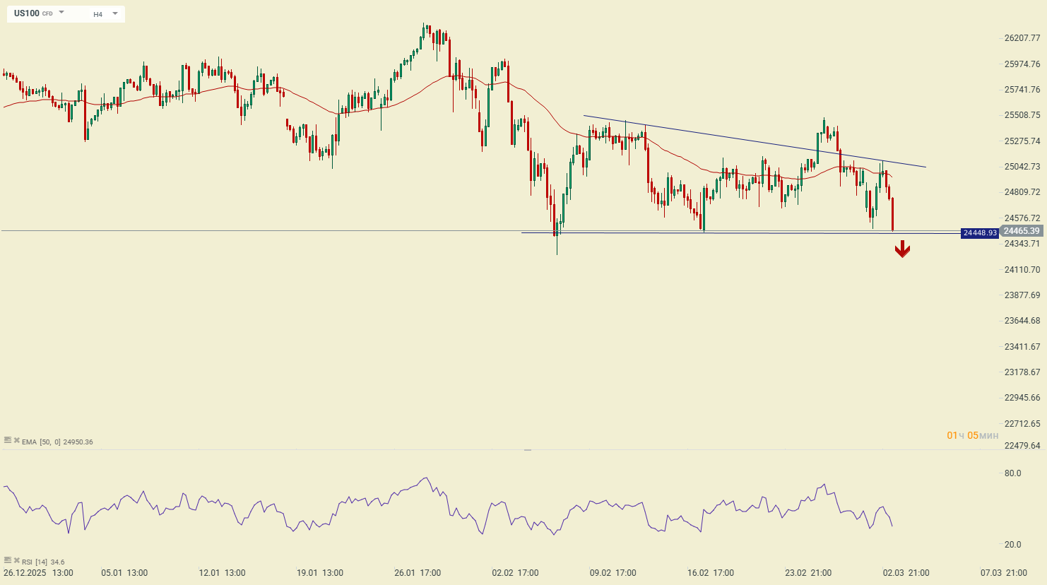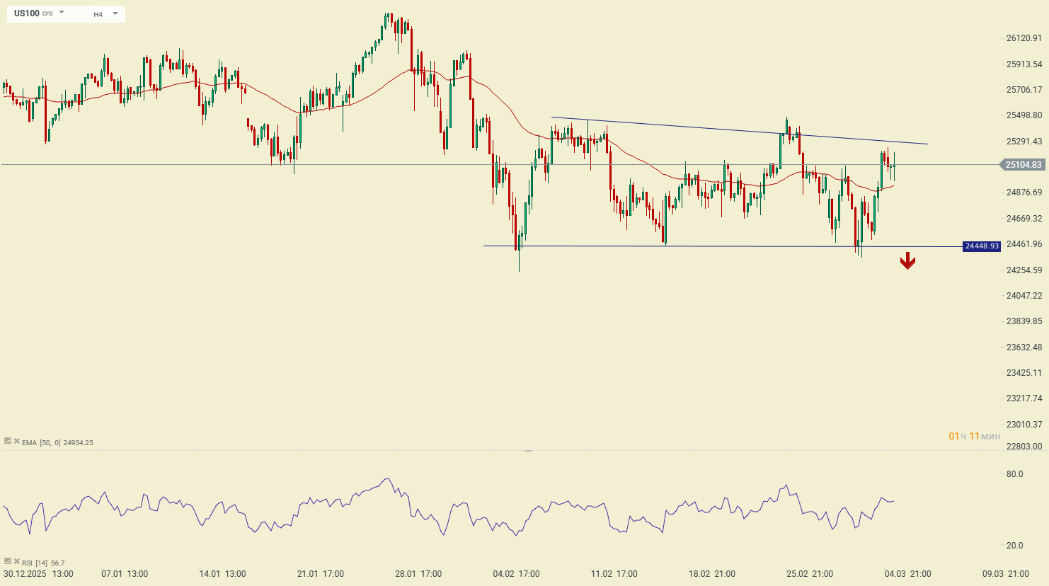 Продавці давлять ціну вниз по фондовому індексу NASDAQ (US100). В результаті на Н4 таймфреймі сформувалася фігура «ведмежий трикутник», яка вказує