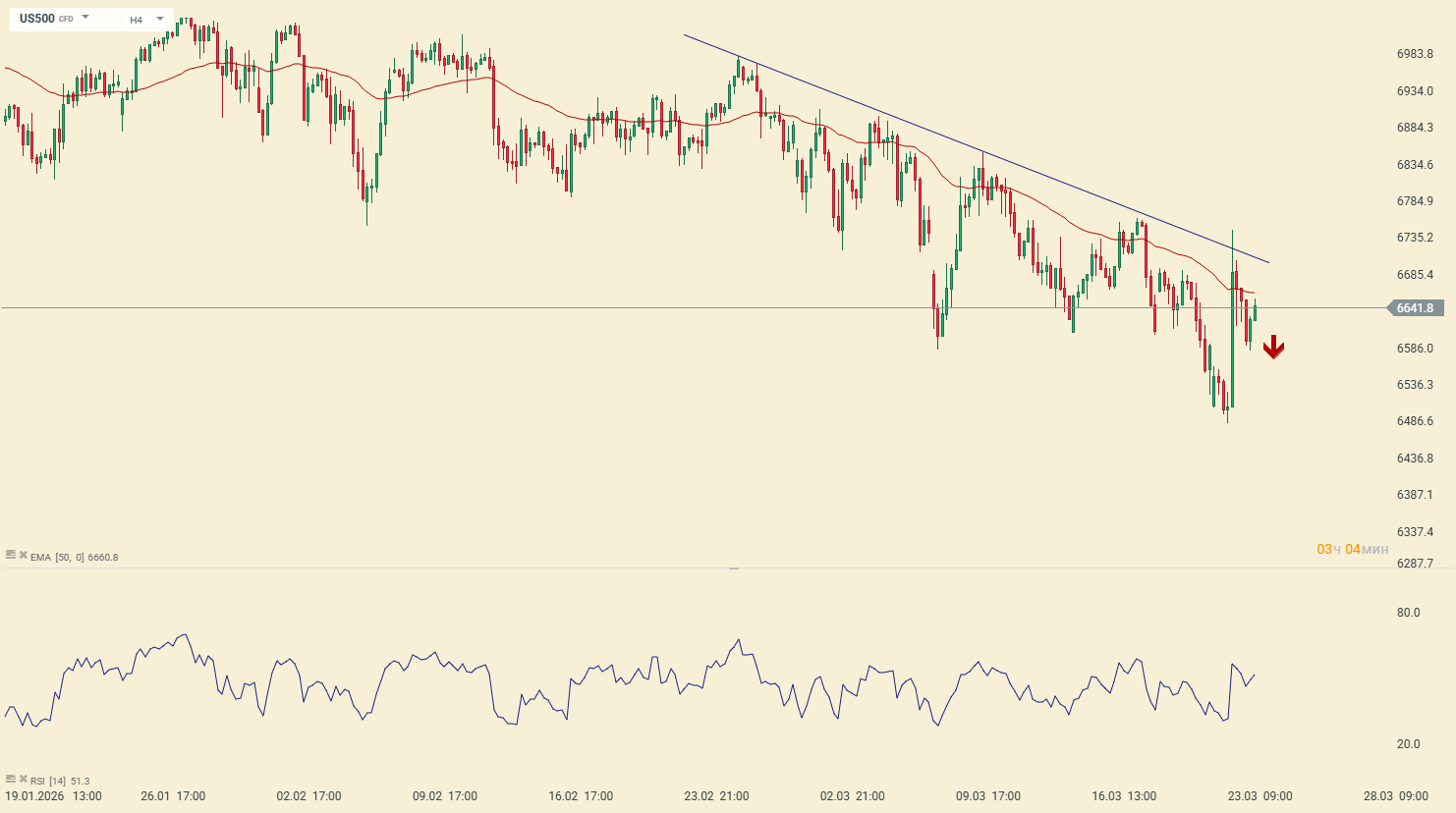 Індекс SP500 (US500) зреагував на спадну трендову лінію опору, що підтверджує перспективу продовження продажів у напрямку короткострокової тенденції. Ціна втримується