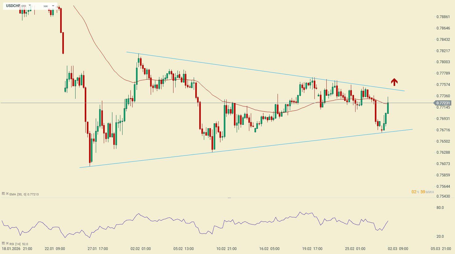 По валютній парі USDCHF триває накопичення позиції у вигляді фігури технічного аналізу «трикутник». Індикатор RSI відбився від зони перепроданості й вказує