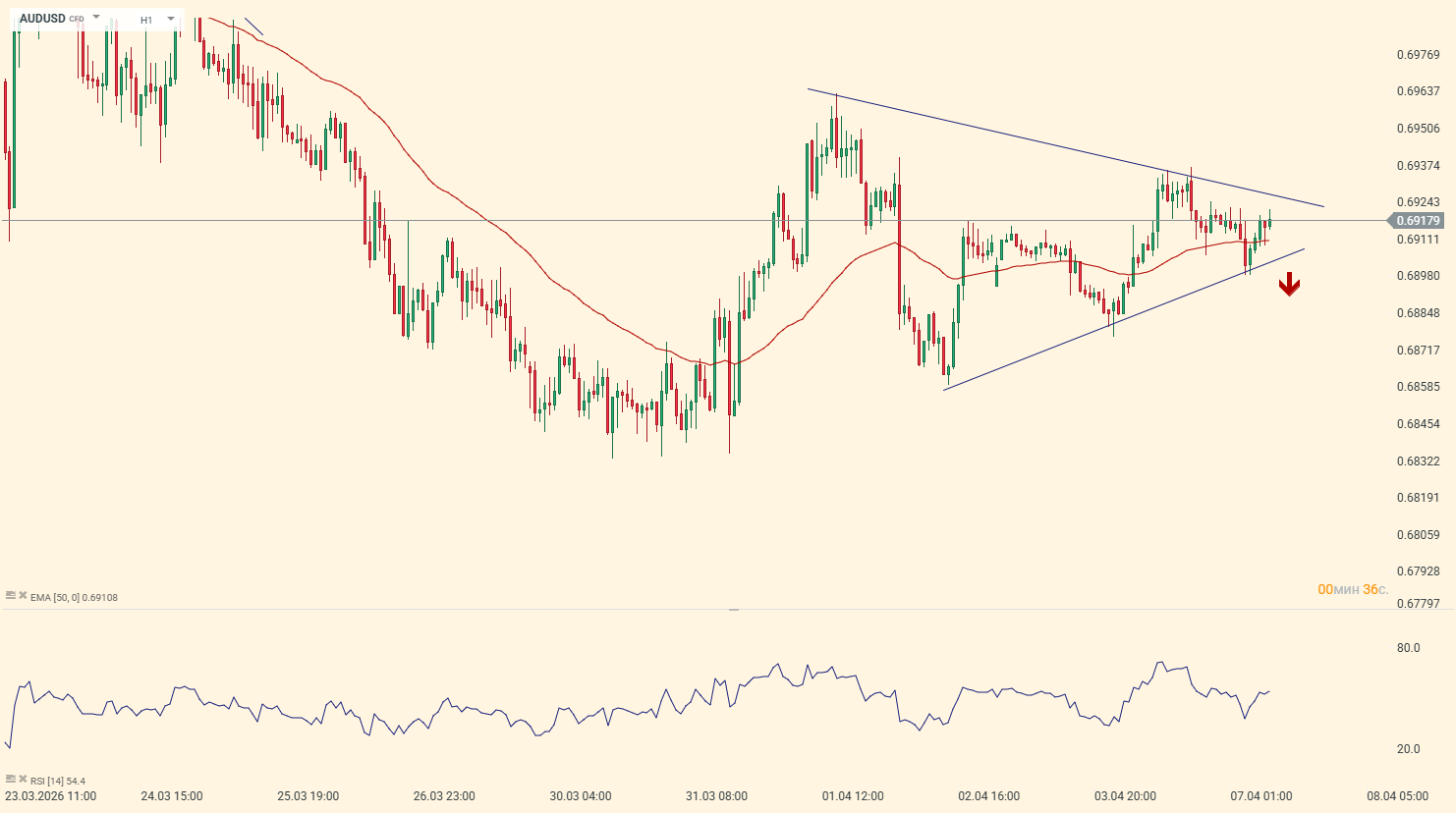 Валютна пара AUDUSD перебуває під тиском ведмедів і набирає торгову позицію для падіння. Формування фігури «трикутник» вказує на локальне накопичення,