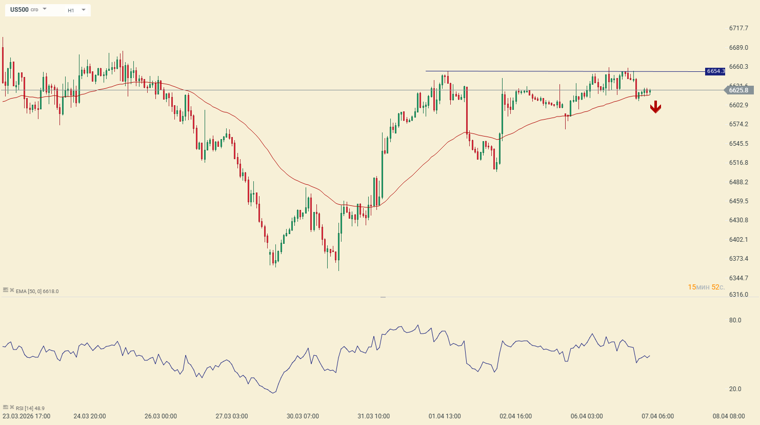 Фондовий індекс SP500 (US500) знаходиться нижче ключового рівня опору 6655 (максимум корекції після падіння в березні) та продовжує набирати позицію