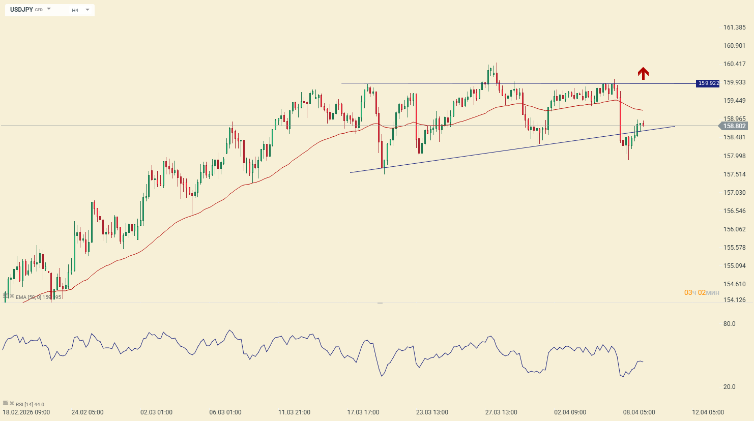 По валютній парі USDJPY зберігаються лонгові пріоритети. Фігура технічного аналізу «висхідний трикутник» з вираженим піджаттям вгору вказує на силу покупців
