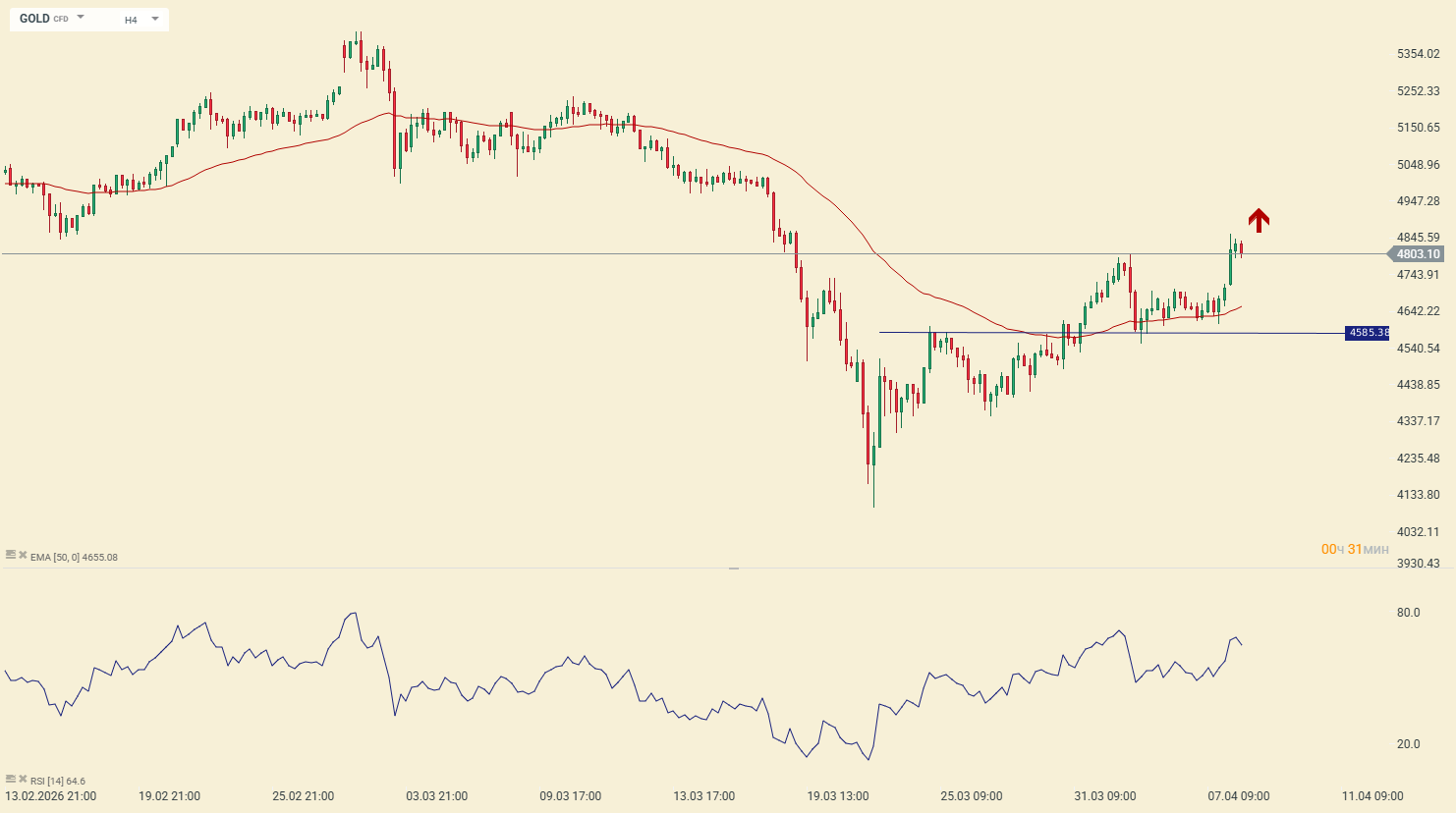 Золото пробило та закріпилося вище локального опору в районі 4585 і вище 50 ЕМА, що вказує на подальше зростання. Поточна