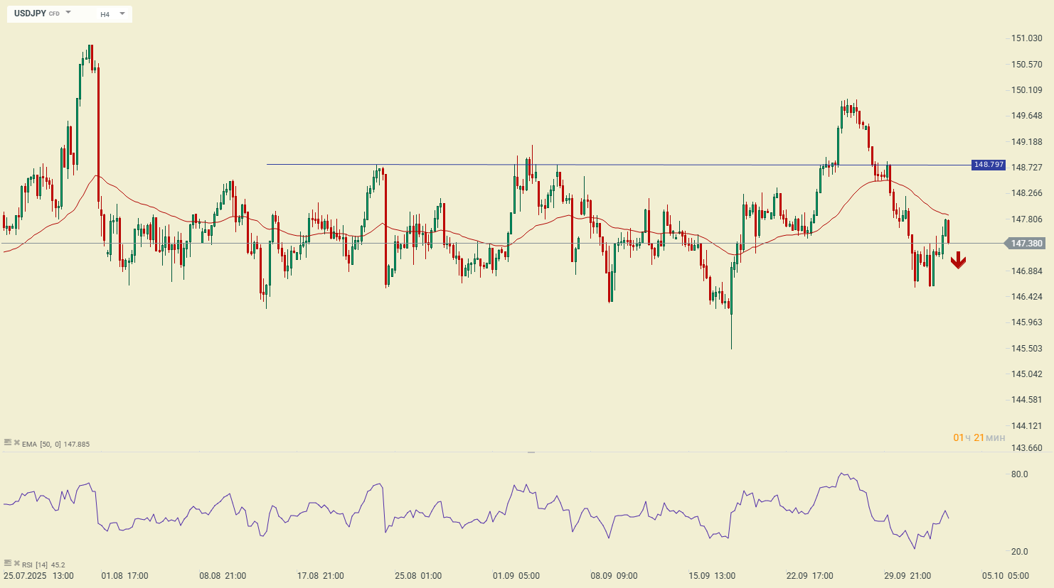 По валютній парі USDJPY зберігаються параметри для продовження продажів. Відбувається тривала консолідація нижче ключового рівня опору 148.80, що означає набір позиції для зниження. Ціна втримується нижче 50 ЕМА та підтверджує шорт. Виходячи з цього, наша рекомендація по USDJPY: продовжувати працювати на продажу нижче опору 148.80 (з поточних цінових показників або після незначної корекції) з найближчою ціллю 145.50. Альтернативний сценарій: закріплення ціни вище за опір 148.80 означатиме скасування шортового сценарію.