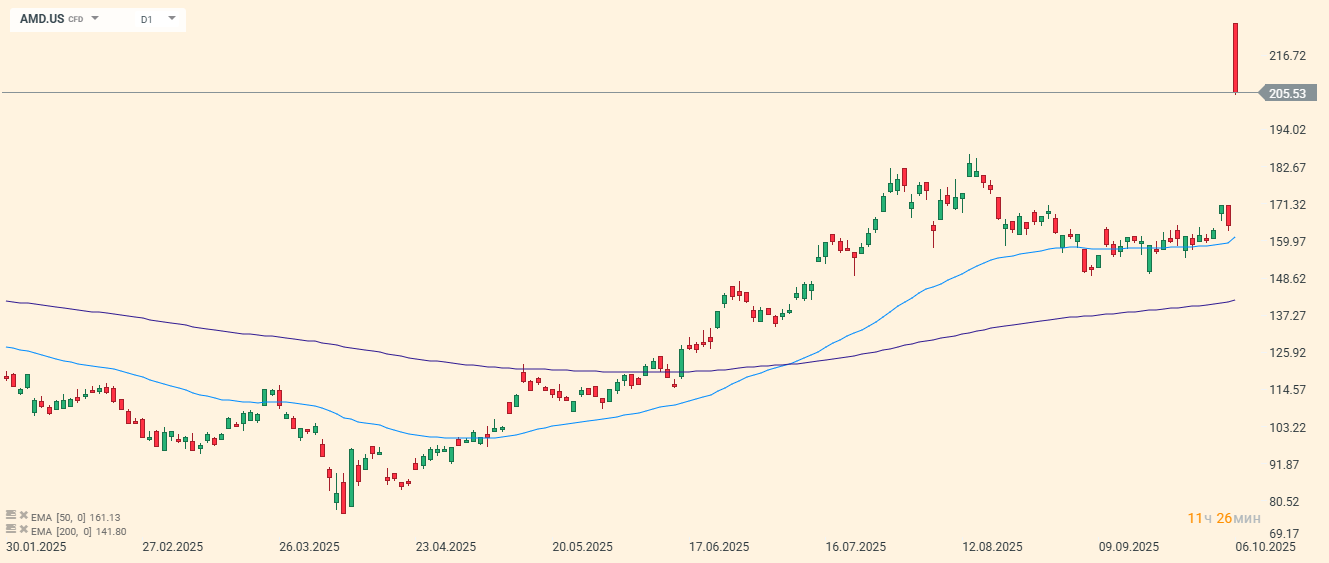 Після оголошення про угоду з OpenAI акції AMD зросли на 23,7%, досягнувши $203,71, що додало близько $80 мільярдів до ринкової капіталізації компанії.