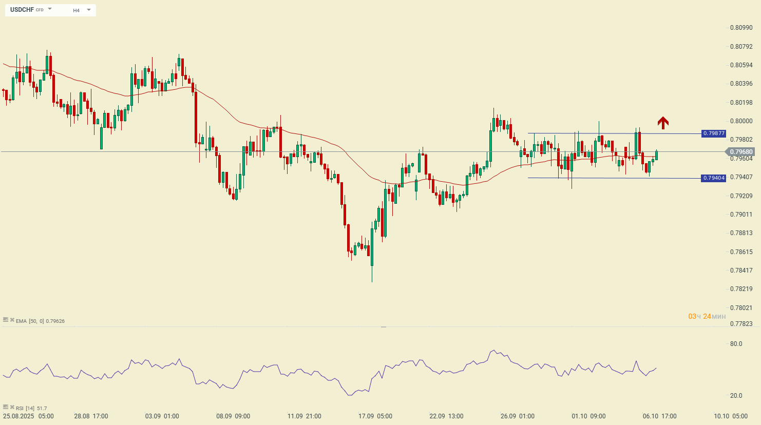Очевидно, трендове зниження валютної пари USDCHF завершилося й інструмент готовий піти на корекцію. Формування фігури технічного аналізу "лонговий прямокутник" вказує на локальну позицію покупців та наявність передумов для контртрендового зростання у бік продовження імпульсного руху від 17-25 вересня. Індикатор RSI втримав підтримку та спрямований наверх. Виходячи з цього, наша рекомендація по USDCHF: покупка з поточних цінових показників, вище за нижньої межі прямокутника 0.7940 або на пробій його верхньої межі в районі 0.7990. Альтернативний сценарій: закріплення нижче мінімумів прямокутника, позначки 0.7940, відкриє шлях для подальшого зниження у бік низхідної тенденції.