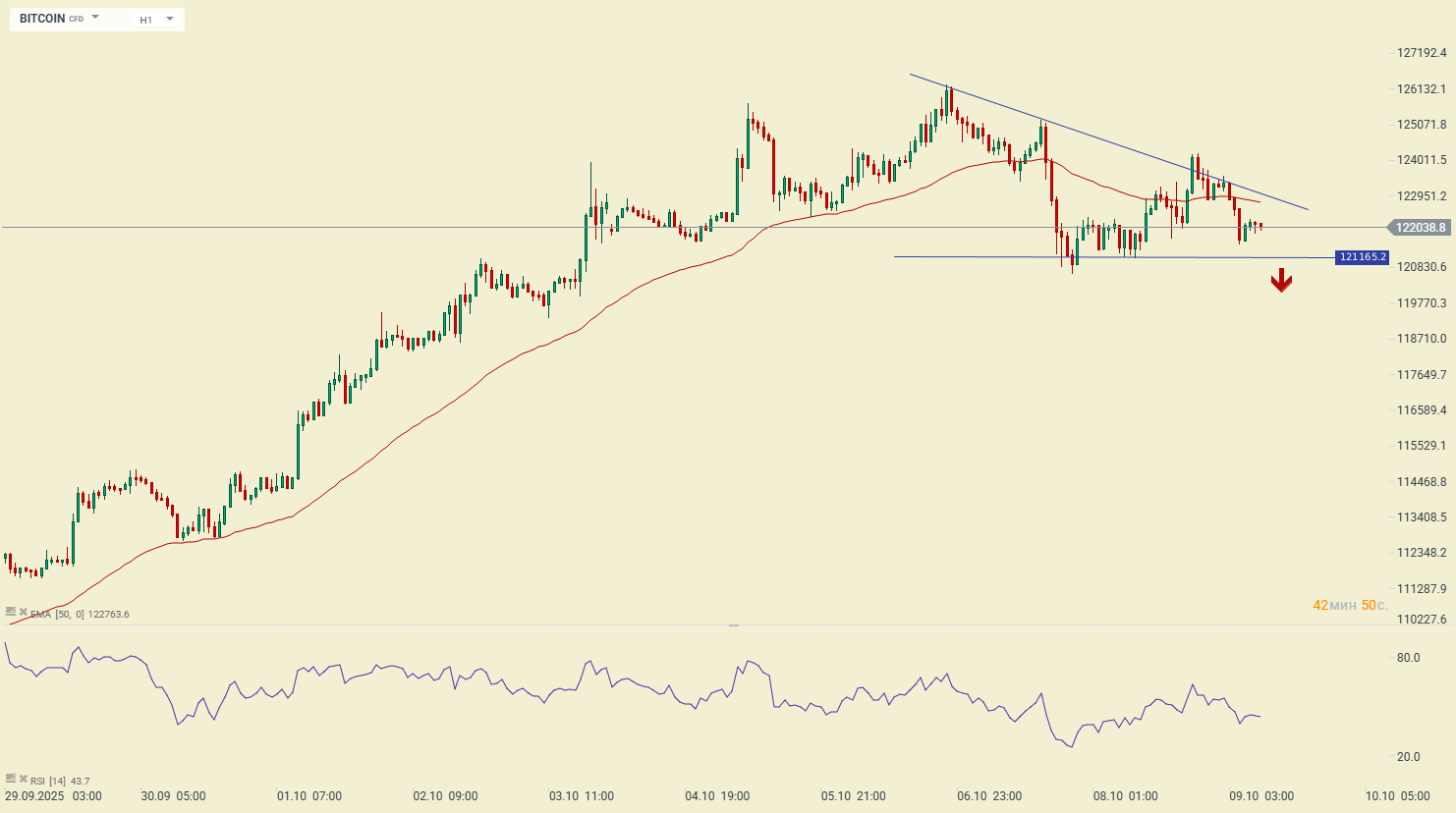 По криптовалюті BITCOIN назріває корекція вниз. Формування фігури технічного аналізу "низхідний трикутник" із закріпленням ціни нижче 50 ЕМА вказує на пріоритет спекулятивного продажу. Індикатор RSI відскочив від зони перекупленості та спрямований вниз. Виходячи з цього, наша рекомендація по BITCOIN: шорт на пробій нижньої межі трикутника 121165. Альтернативний сценарій: імпульсна реакція наверх з пробиттям та закріпленням вище верхньої межі трикутника відкриє шлях для подальшого трендового зростання.
