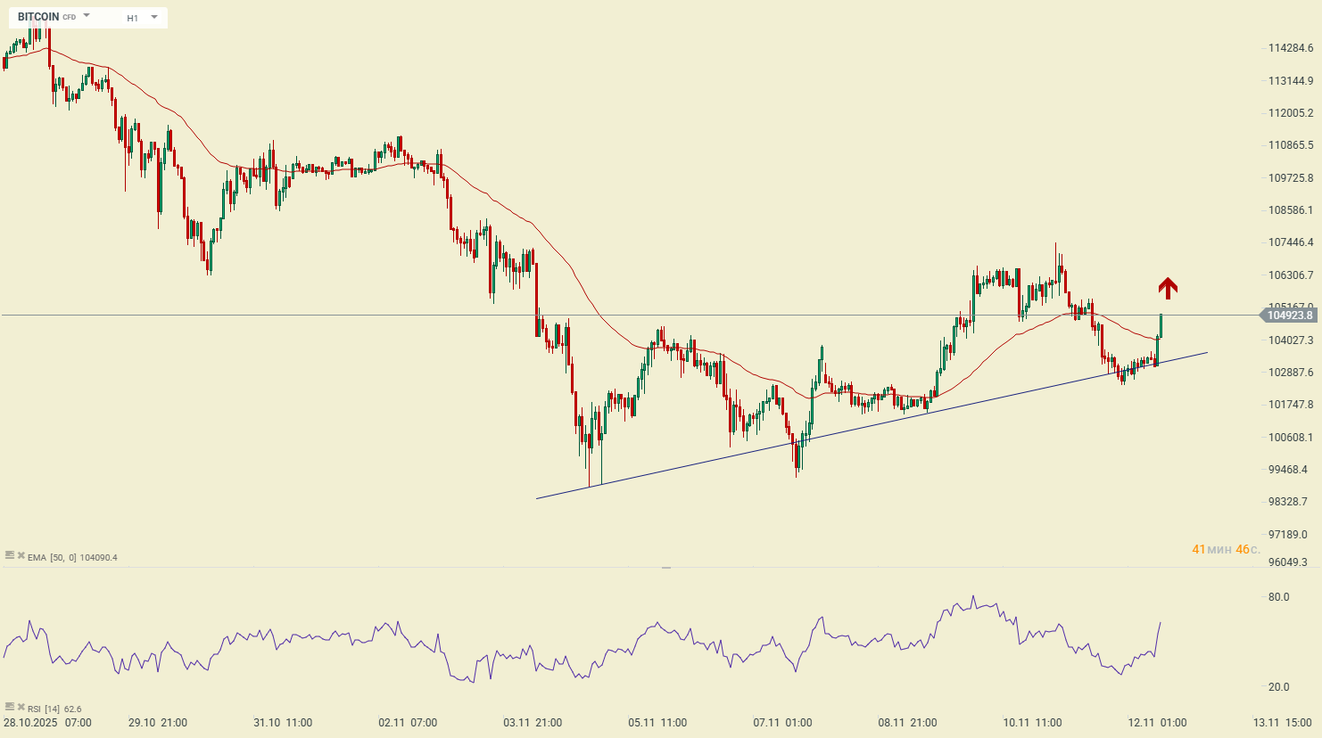 По криптовалюте BITCOIN произошло пробитие и закрепление выше ключевого зеркального уровня сопротивления в районе 104500. Это указывает на потенциал роста