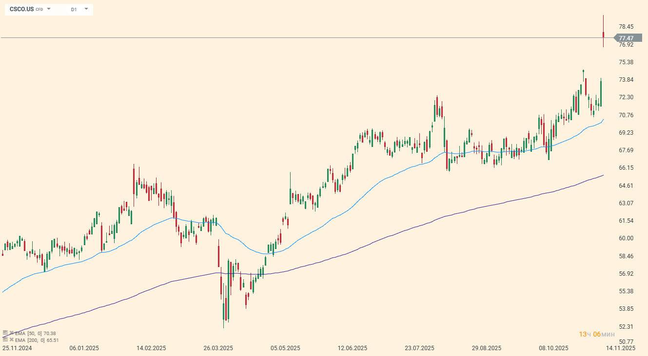 Sector: Technology, Industry: Networking Equipment & ServicesPrice: 71.11, Market Cap: 281 B По итогам Q1 FY2026 (опубликовано 12.11.2025) общая выручка составила
