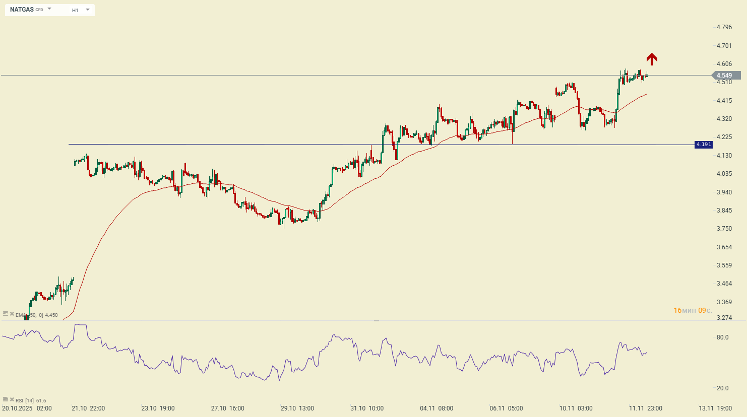 Газ NATGAS консолидируется выше ближайшего зеркального уровня поддержки 4.190, что указывает на накопление позиции для роста. Цена удерживается выше 50 ЕМА