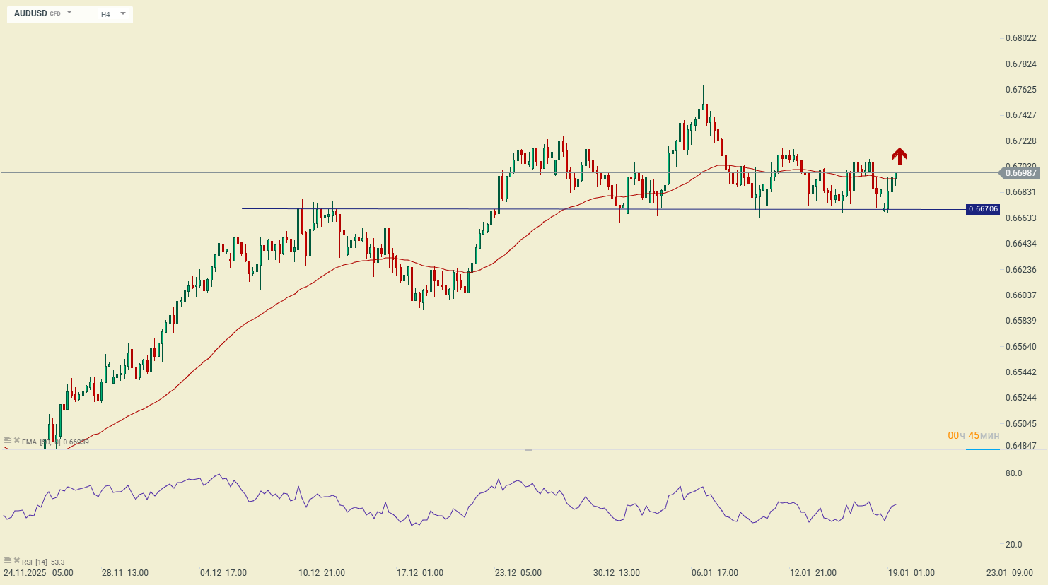 По валютной паре AUDUSD происходит борьба за ключевой зеркальный уровень поддержки в районе 0.6670. Продолжительное удержание цены выше этого уровня
