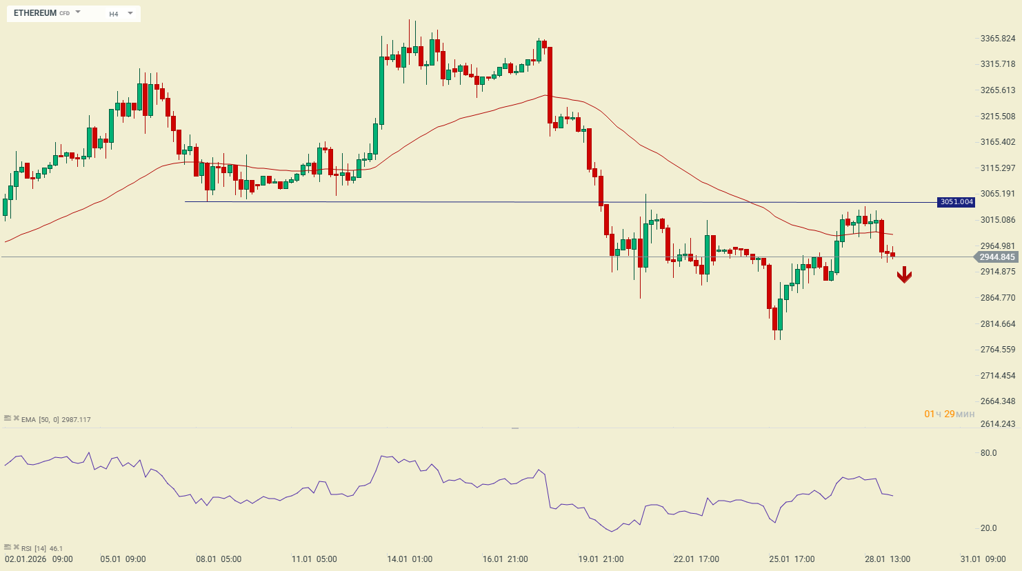Криптовалюта Ethereum консолидируется ниже ближайшего зеркального уровня сопротивления, чем подтверждает вероятность продолжения среднесрочной нисходящей тенденции. Цена находится ниже 50 ЕМА и