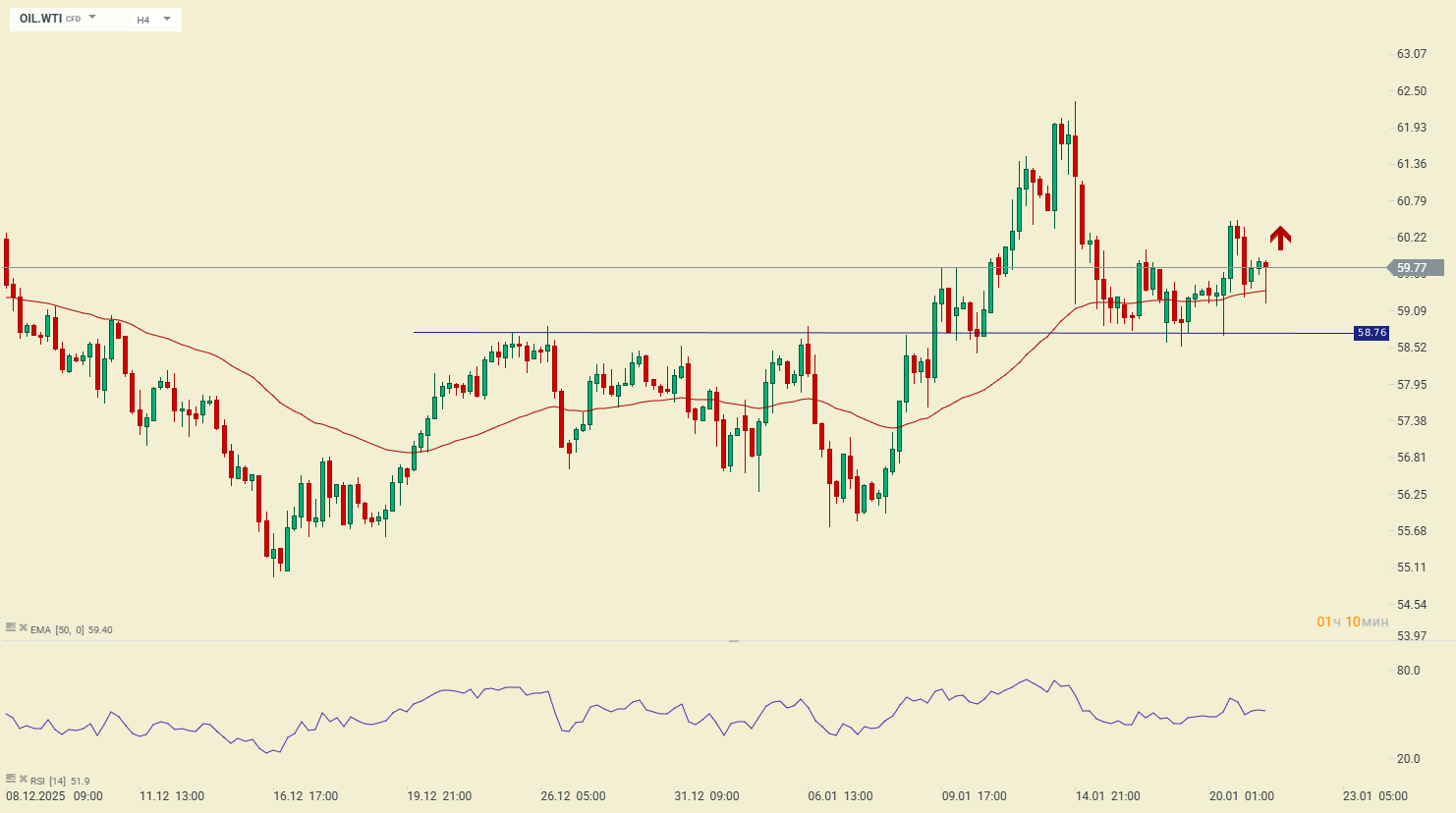 Нефть марки WTI (OIL.WTI) скорректировалась до ближайшей реверсной поддержки и подтверждает продолжение роста. Реакция на поддержку 58.75 указывает на возможное