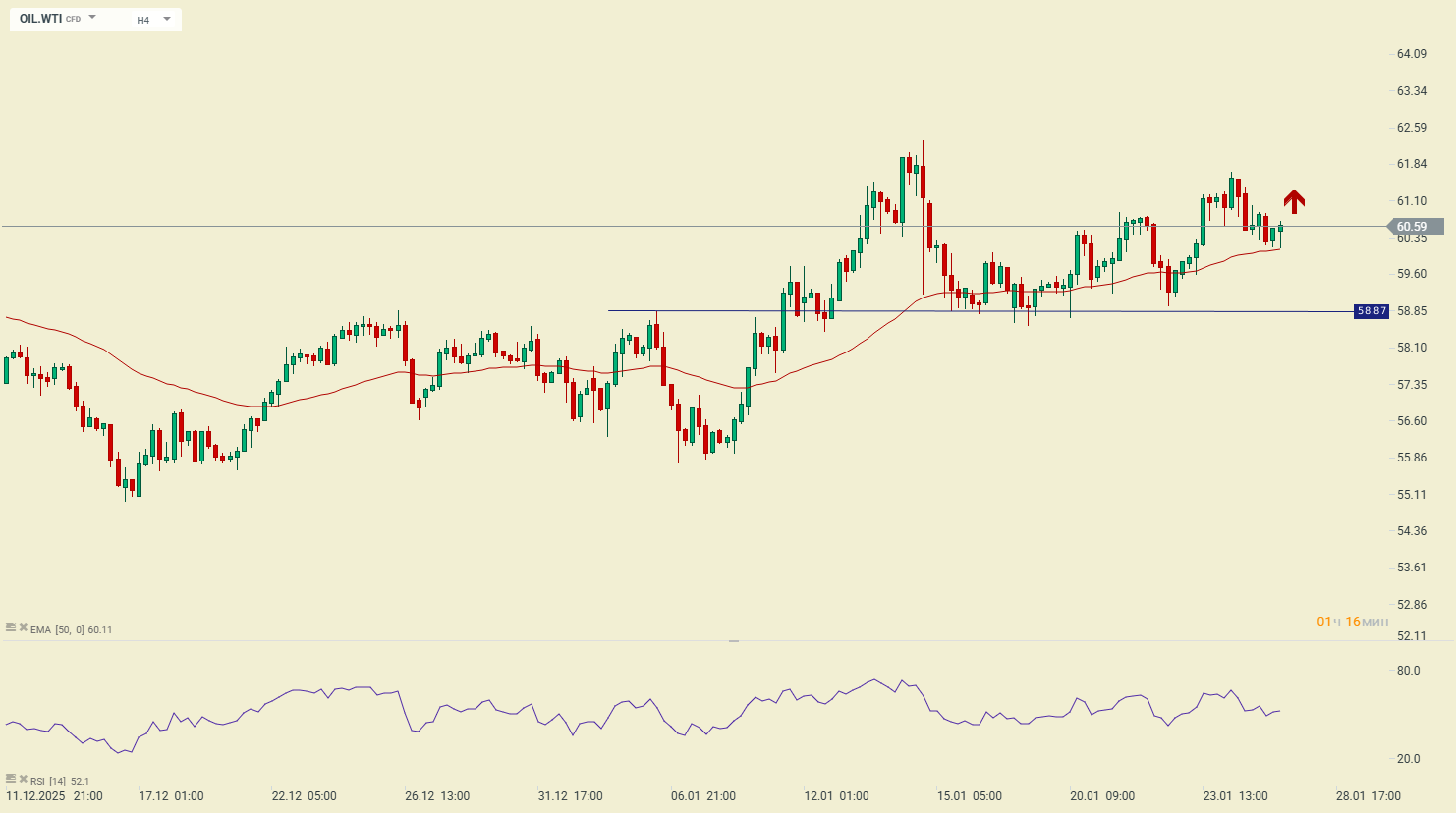 Нефть марки WTI (OIL.WTI) продолжает набирать торговую позицию для роста. Консолидация выше зеркальной поддержки 58.85 указывает на завершение локальной коррекции