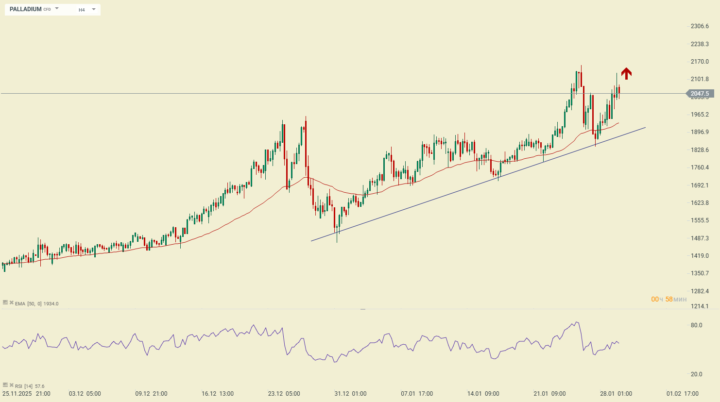 По палладию PALLADIUM подтверждаются трендовые лонговые приоритеты. Удержание восходящей трендовой линии сигнализирует о накоплении позиции для роста в сторону долгосрочной