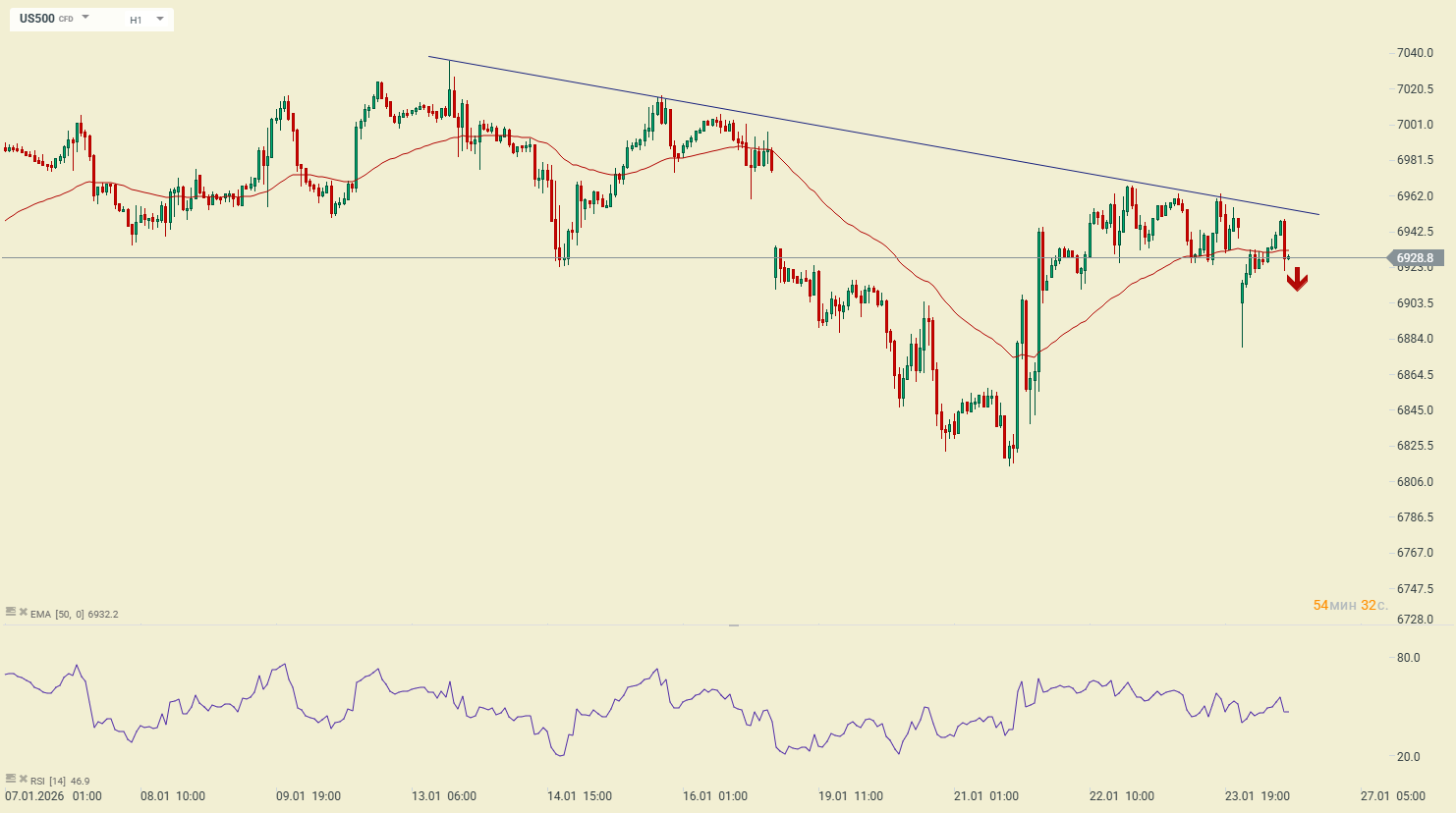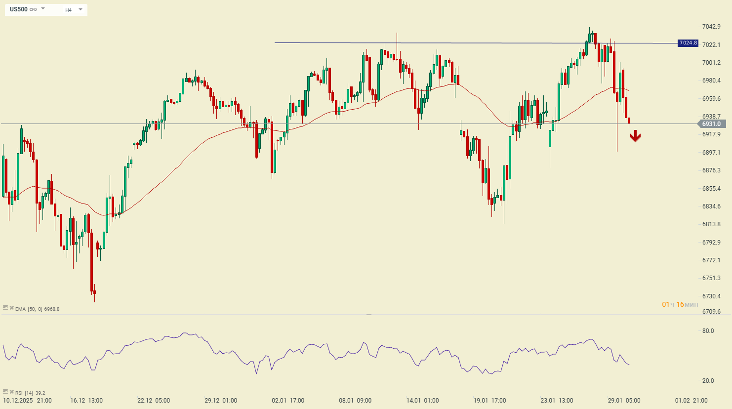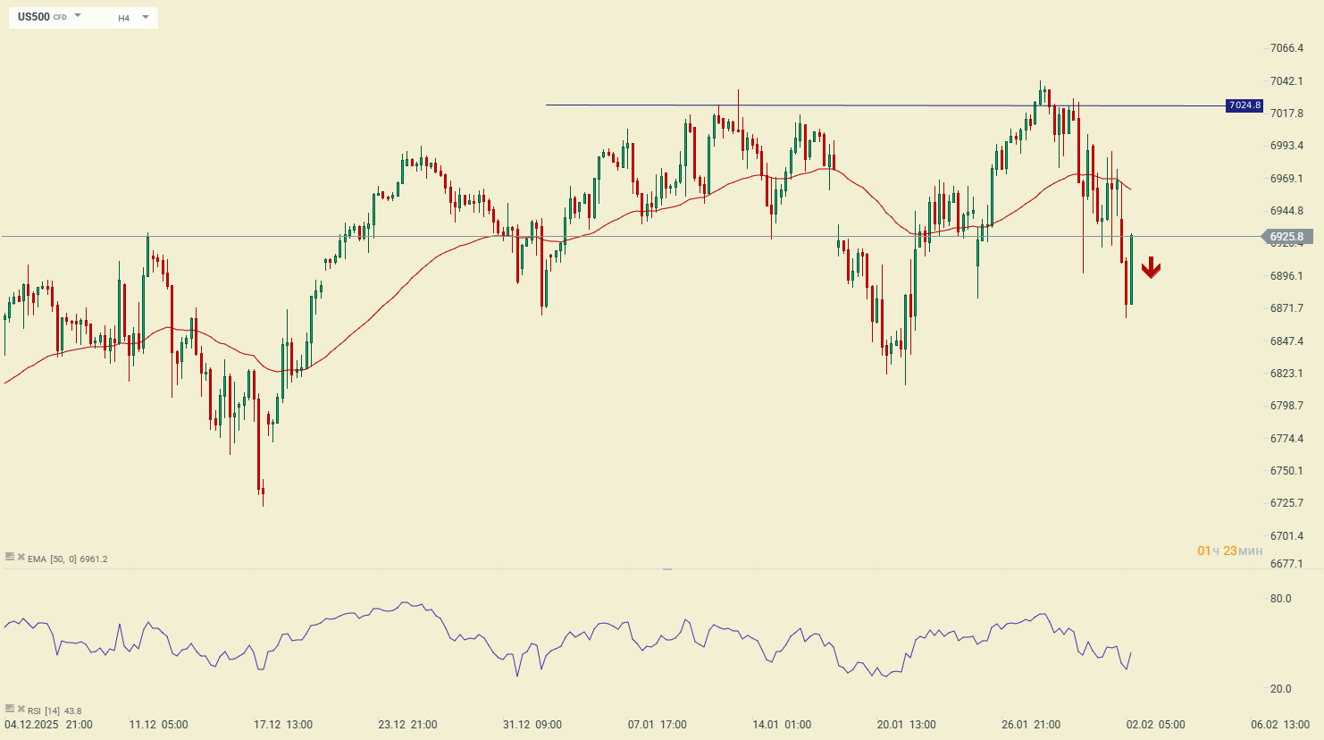 Попытка быков по индексу SP500 (US500) прорваться выше исторических максимумов в районе 7025 закончилась обратной реакцией вниз с закреплением ниже 50