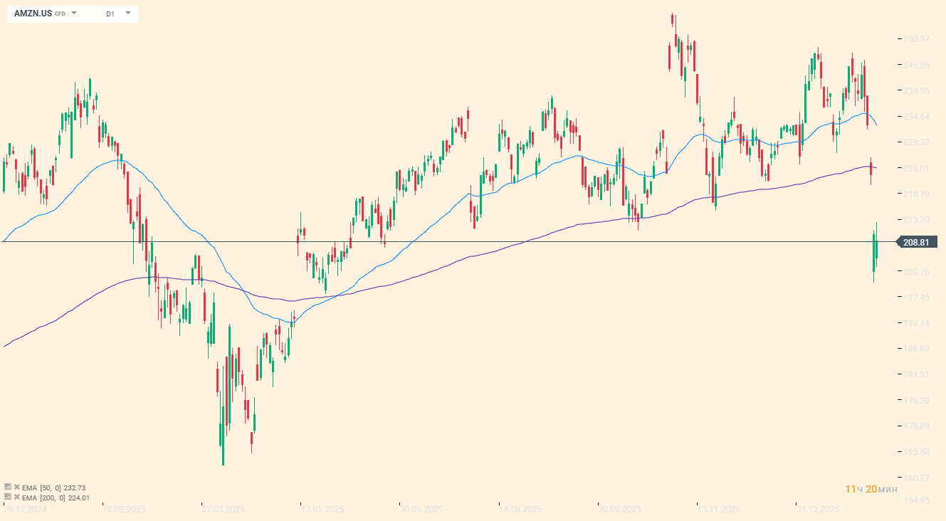 Sector: Consumer CyclicalIndustry: Internet RetailPrice: $208.7 (share price)Market Cap: $2.2T Q4 FY2025 (опубликовано 05.02.2026) Совокупная выручка Amazon за квартал составила $213.4 млрд (+14%