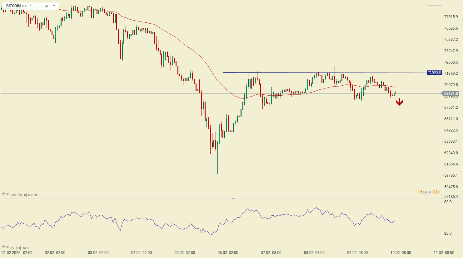 После импульсного пролива вниз криптовалюта BITCOIN показала коррекционный рост и удерживает ближайшее сопротивление. Реакция на сопротивление в районе 71500 в виде