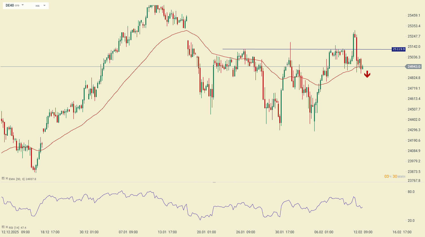 Фондовый индекс DAX (DE40) находится ниже ключевого откатного уровня сопротивления 25120 и продолжает набирать позицию для коррекции вниз. Индикатор RSI отскочил