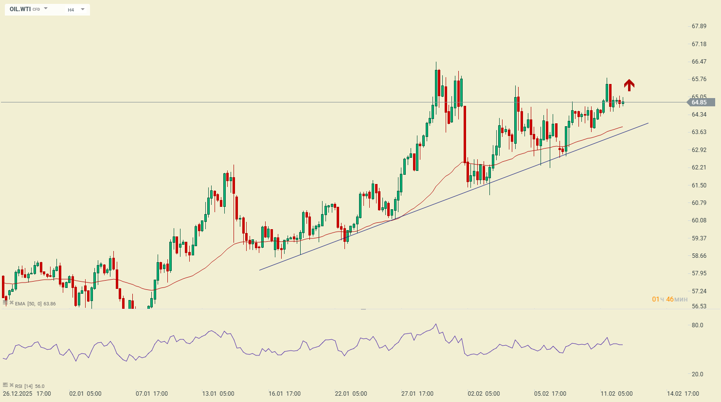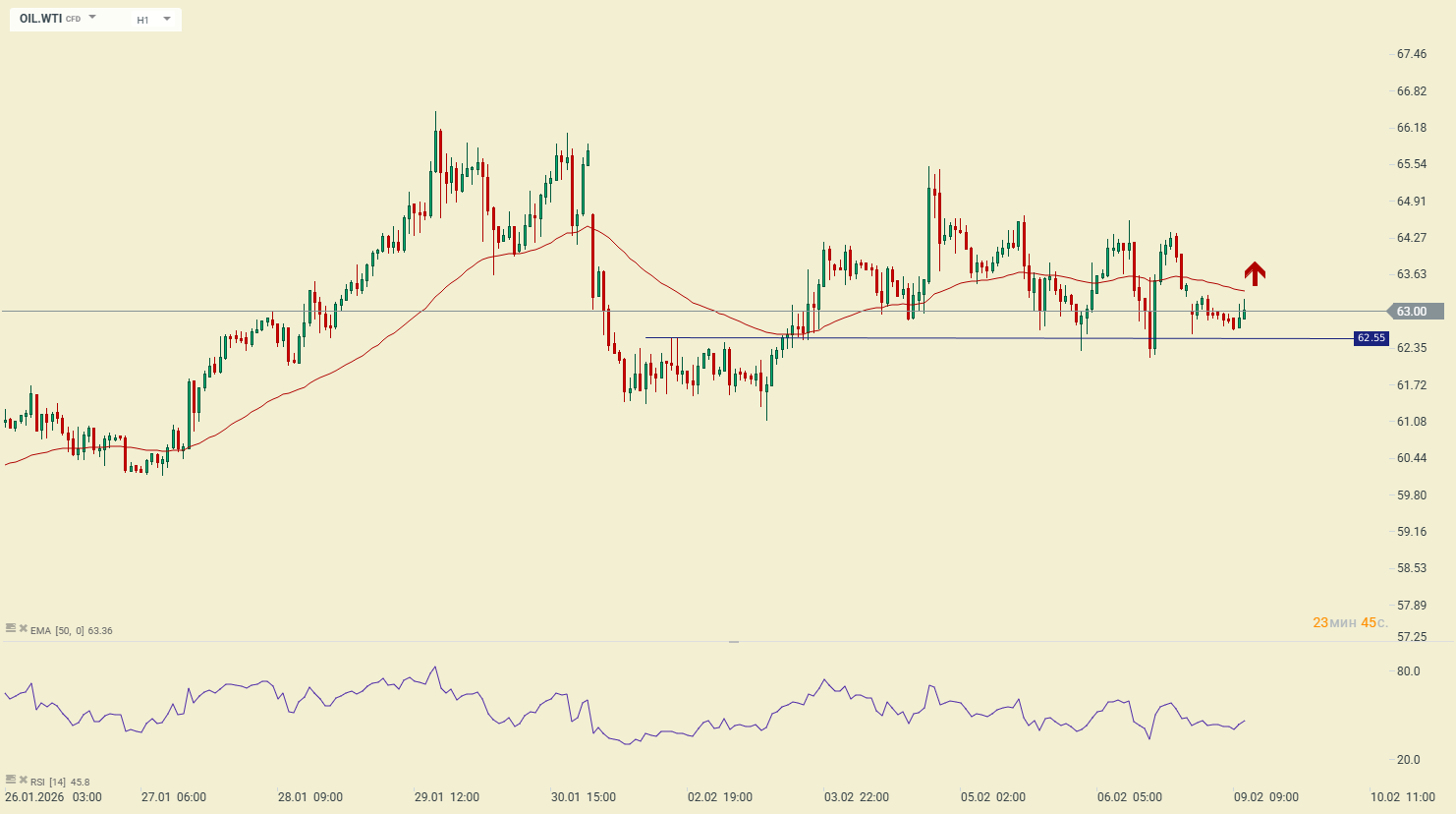 Нефть марки WTI (OIL.WTI) скорректировалась до ближайшей реверсной поддержки и подтверждает продолжение роста. Реакция на поддержку 62.55 в виде продолжительной