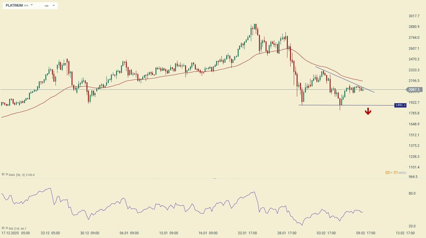 Продавцы давят цену по платине PLATINUM. В результате на Н4 таймфрейме сформировалась фигура "медвежий треугольник", которая указывает на приоритет продолжения
