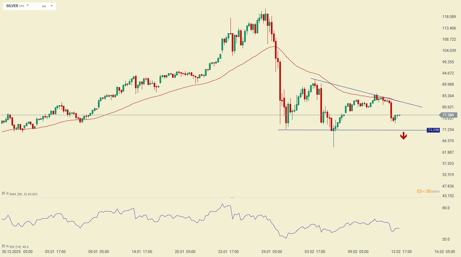 Медведи уверенно удерживают свои позиции по серебру SILVER. Коррекция вниз нашла отображение в формировании фигуры "медвежий треугольник", что указывает на силу