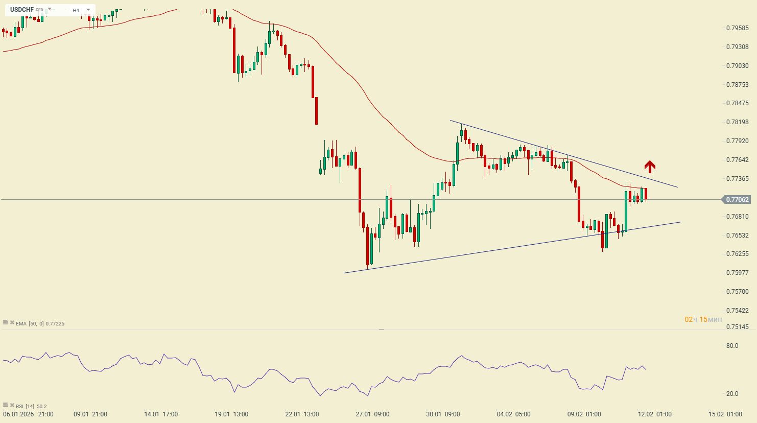 По валютной паре USDCHF происходит накопление позиции в виде фигуры технического анализа "треугольник". Индикатор RSI отбился от зоны перепроданности и указывает