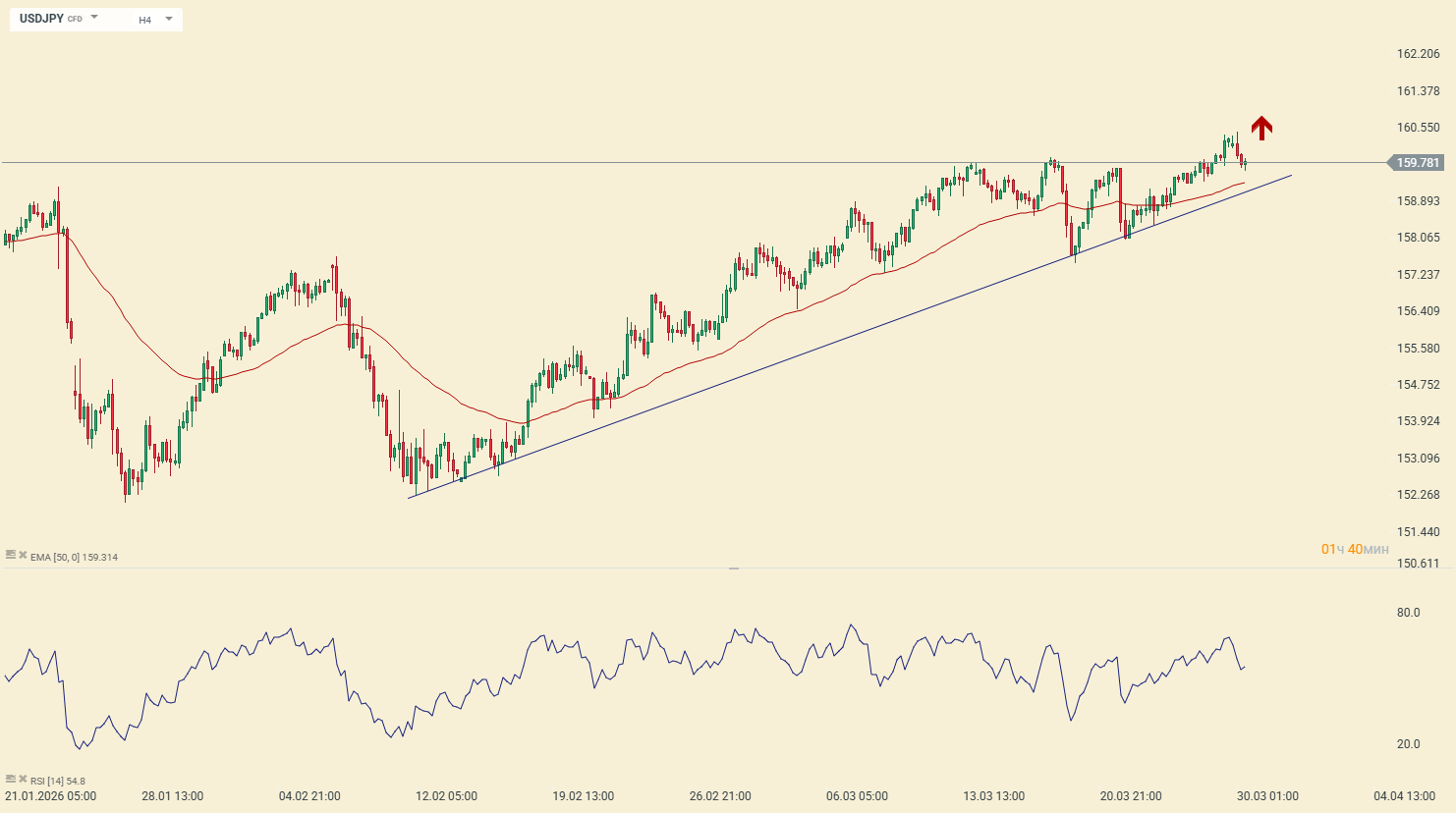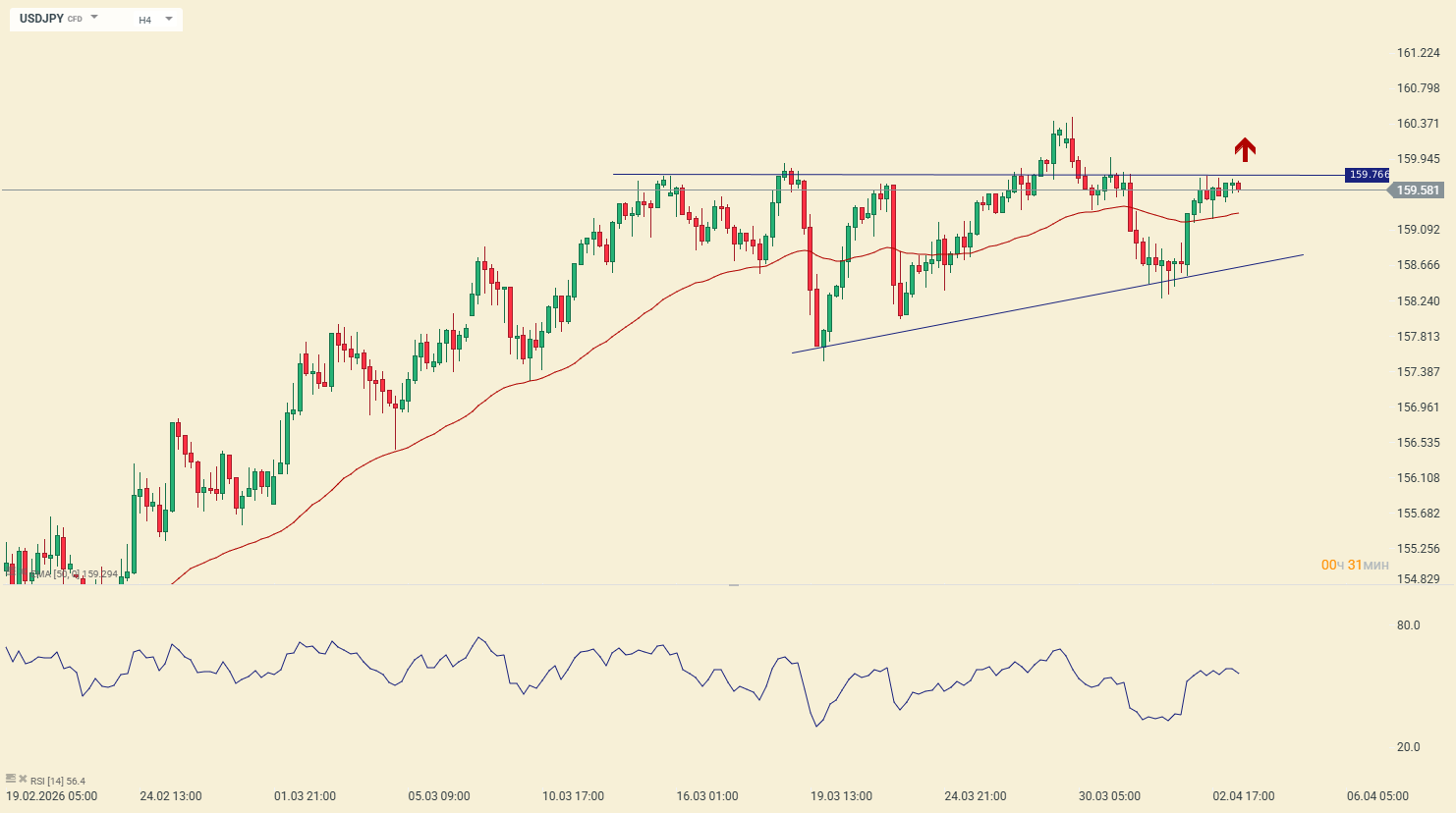 Валютная пара USDJPY за последние торговые недели удерживает восходящую трендовую линию, что указывает на перспективу продолжения роста. Цена закрепилась выше 50