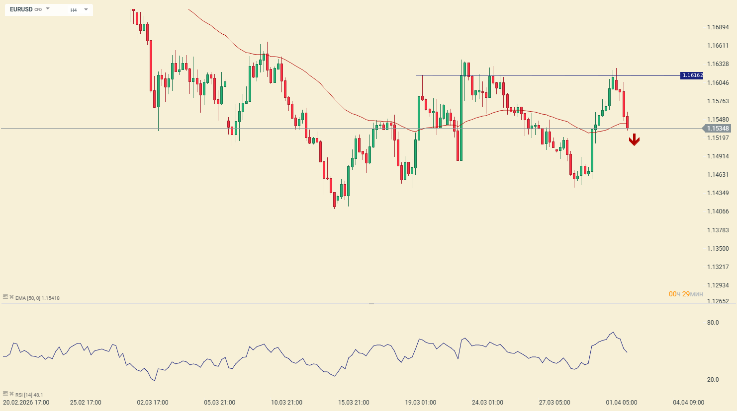 Валютная пара EURUSD торгуется ниже ключевого уровня сопротивления - максимума 19 марта (коррекция в рамках предыдущего падения). Удержание цены ниже этого