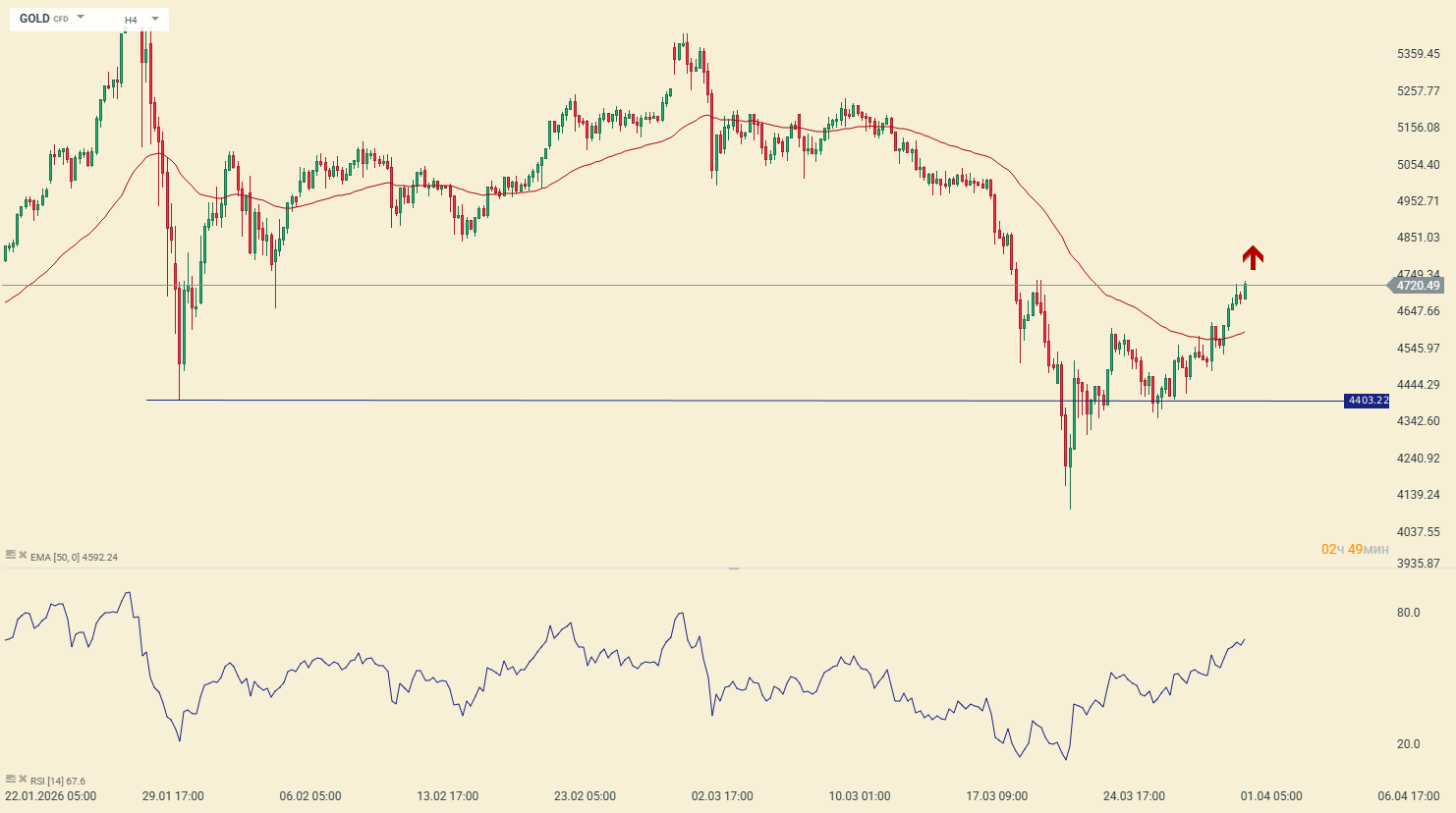 Золото GOLD среагировало на поддержку в районе 4400 (минимум коррекции на восходящем тренде). Продолжительная консолидация выше уровня указывает на возможное