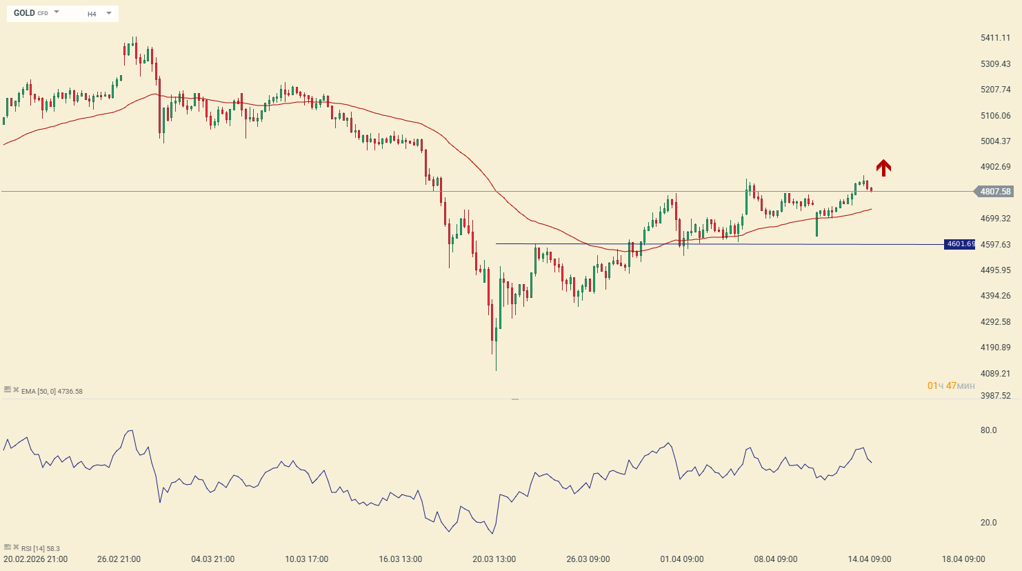 Золото GOLD консолидируется выше ключевой зеркальной поддержки 4600, что указывает на набор позиции покупателями для движения в сторону долгосрочной восходящей