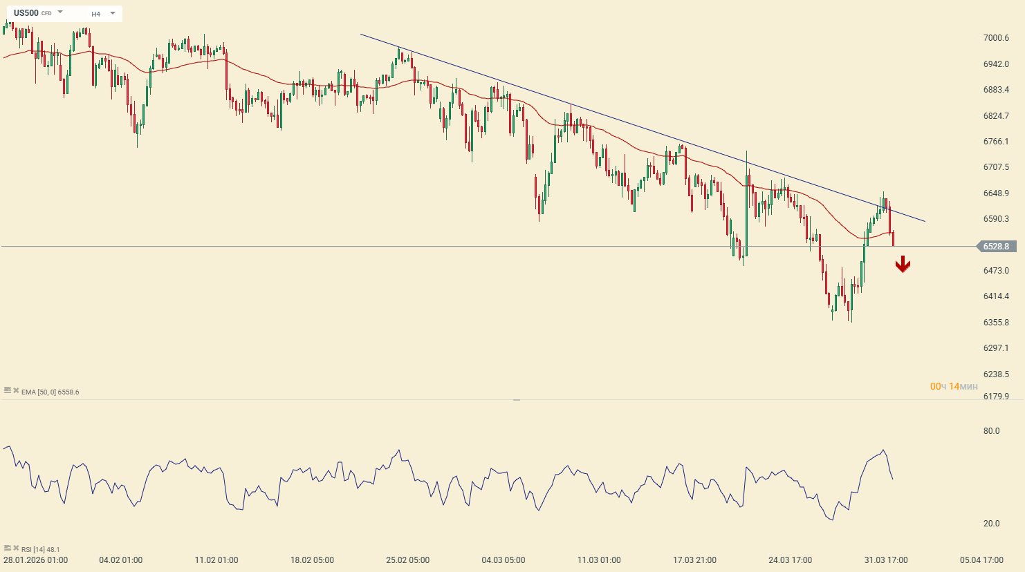 Индекс SP500 (US500) среагировал на нисходящую трендовую линию сопротивления, чем подтверждает перспективу продолжения продаж в сторону краткосрочной тенденции последних торговых
