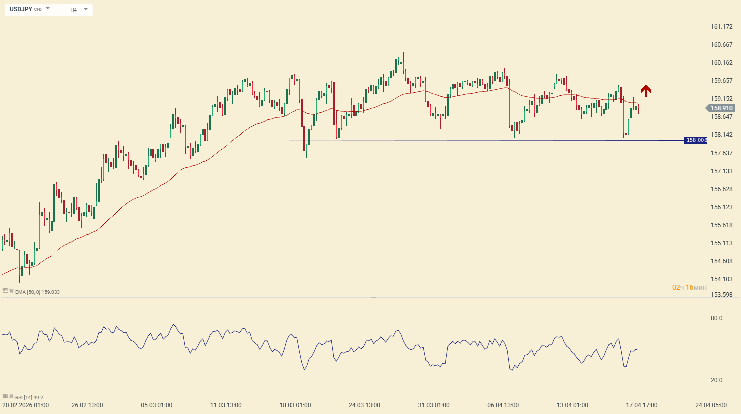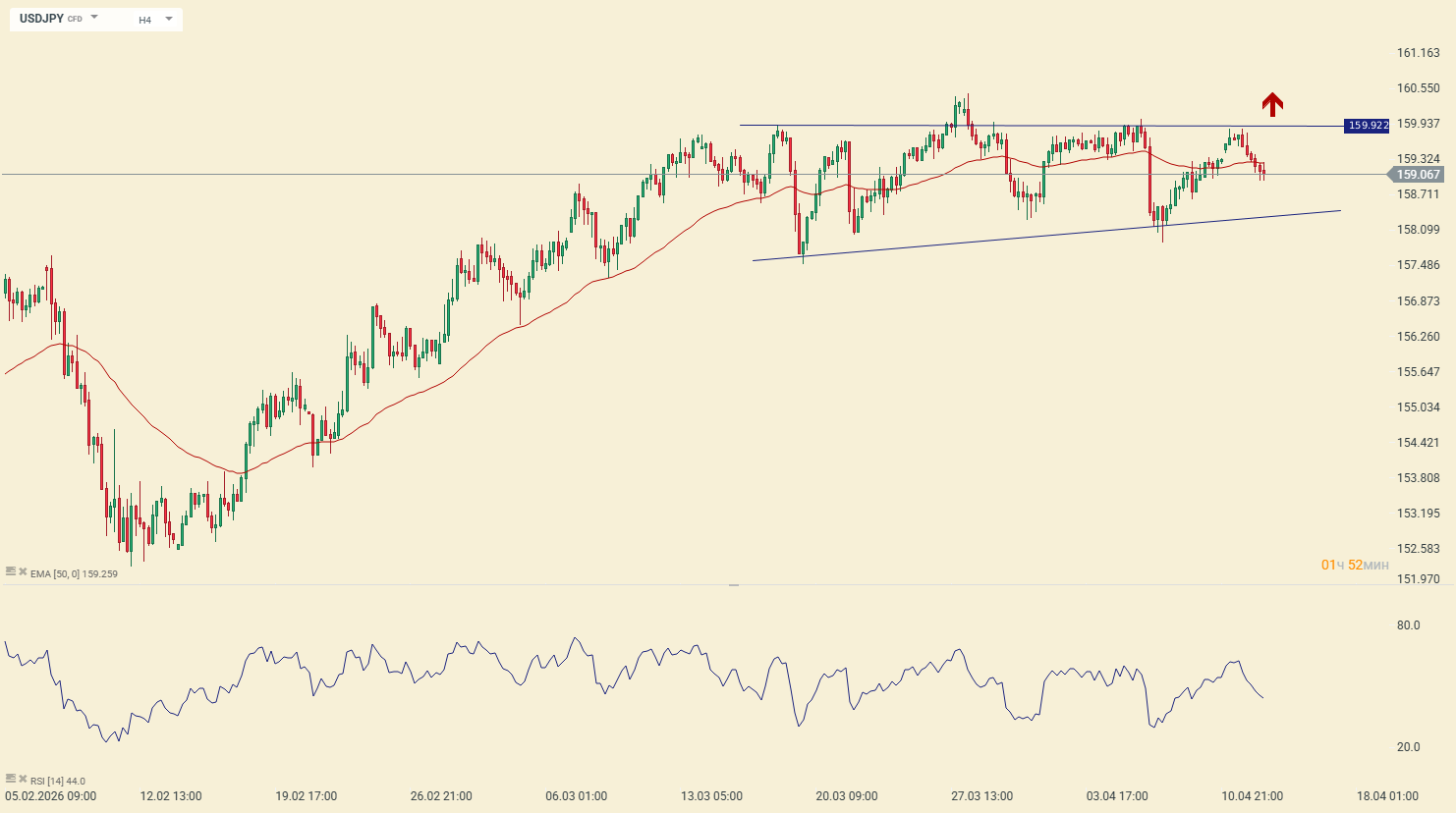 По валютной паре USDJPY происходит накопление позиции, с которого ожидается выход наверх. Фигура технического анализа "восходящий треугольник" указывает на формирование