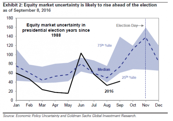 Во-вторых, ожидается рост политической неопределенности, которая транслируется в сокращение мультипликаторов P/E. Первые из трех запланированных президентских дебатов назначены на 26 сентября. Следующие дебаты состоятся 9 октября и 19 октября. Хотя рынки прогнозируют примерно семидесятипроцентную вероятность победы Хиллари Клинтон, последние опросы указывают на большую неопределенность исхода выборов, и эта неопределенность обычно негативно сказывается на рынках акций.