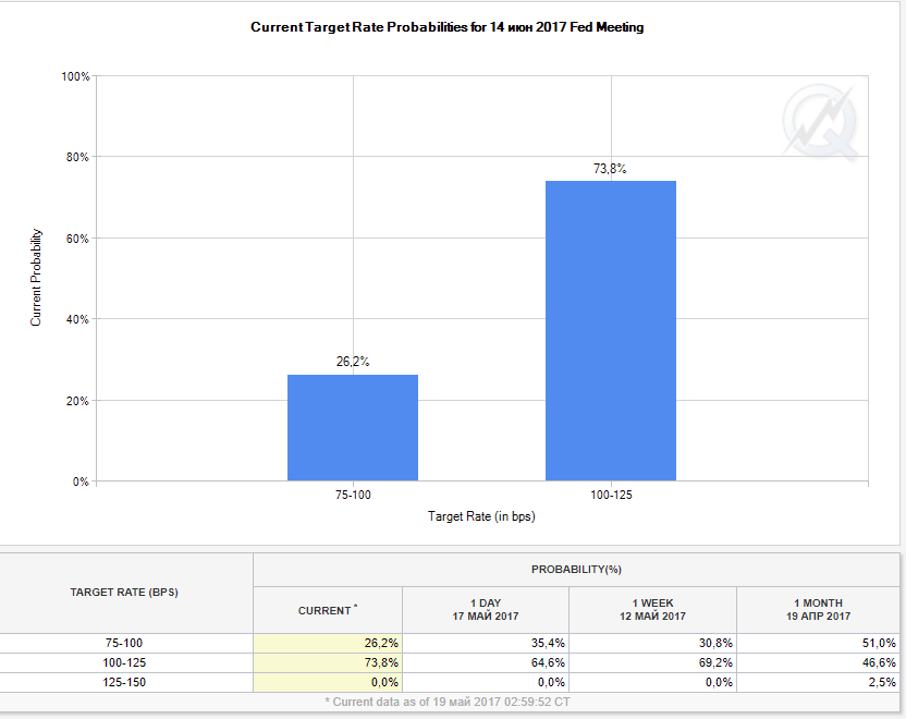 В настоящее время фьючерсы на ставку ФРС указывают, что вероятность повышения процентных ставки ФРС на заседании в июне составляет 73.8% по сравнению с 69.2% неделей ранее.