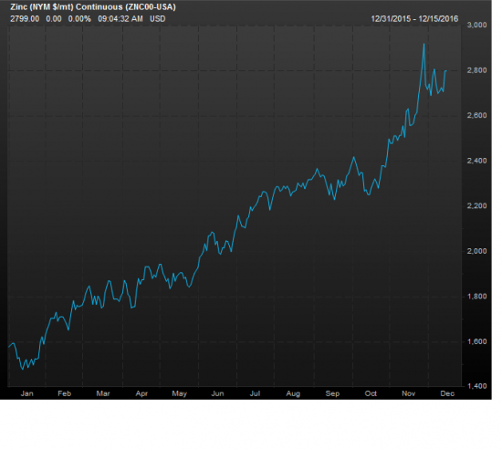 В 2016 цены на цинк выросли на 72%. Будущее металл зависит от Китая, который является крупнейшим производителем, потребителем и переработчиком цинка. Рынок испытывал беспокойство по поводу роста Китая в первой половине года, но во второй половине инвесторы увидели перспективы повышения расходов на инфраструктуру, которые в сочетании с прогнозами дефицита в поставках могут загнать цены еще выше.