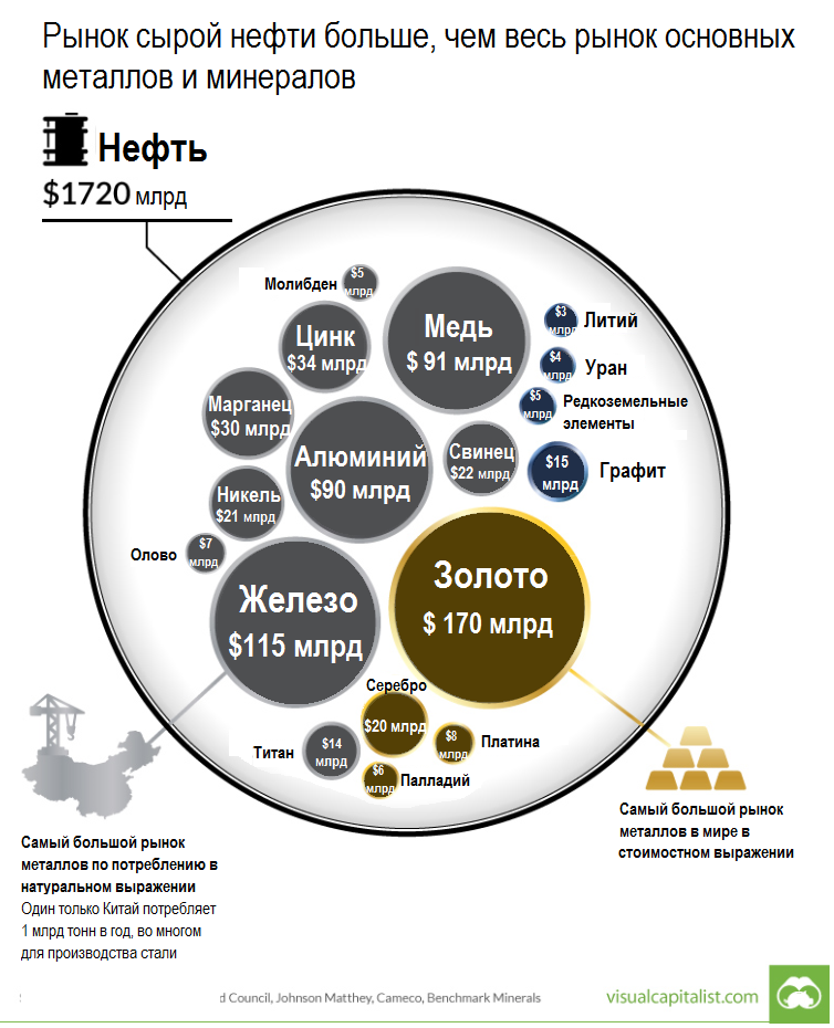 Общий размер рынка металлов 660 млрд, что составляет 38% от размеров рынка нефти.