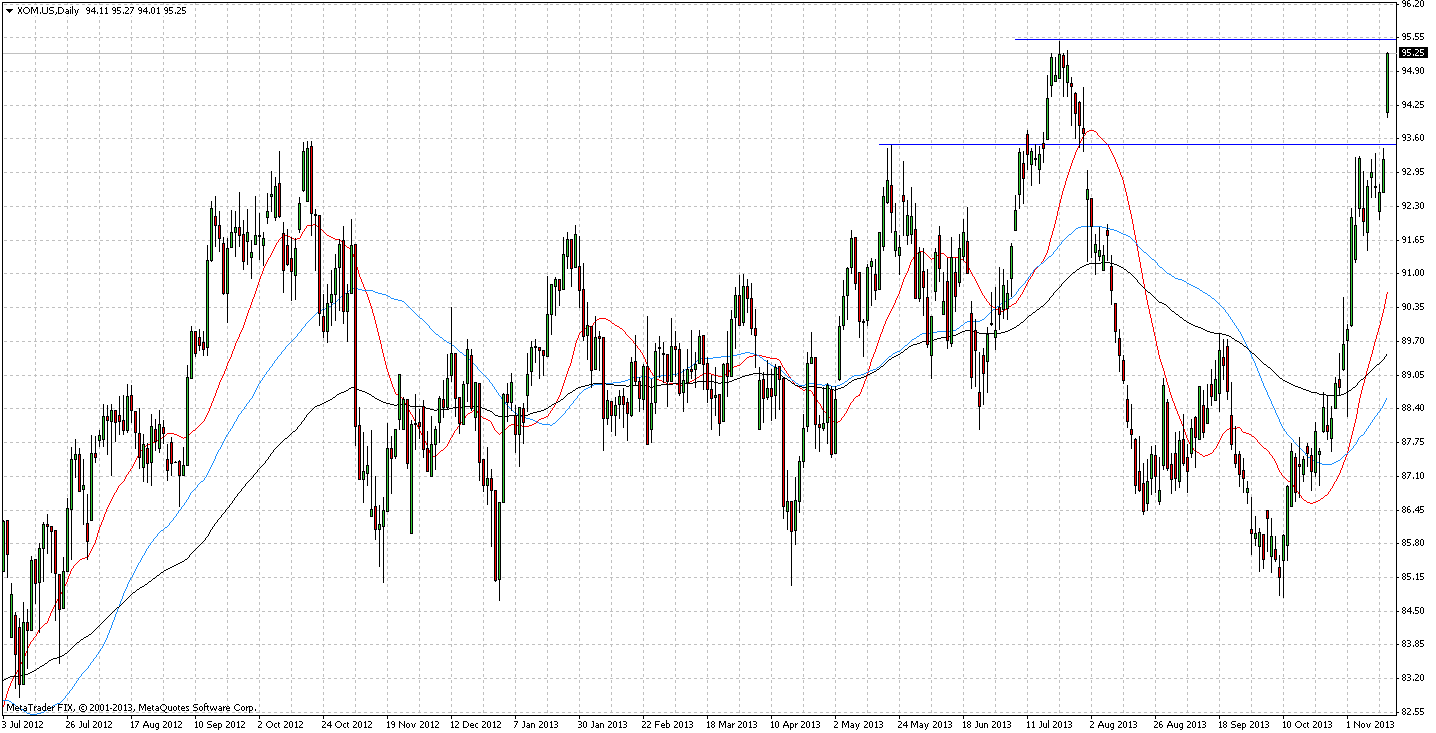 На днях прозвучала информация о том, что Уоррен Баффет, президент инвестиционной компании Berkshire Hathaway, приобрел крупный пакет акций Exxon Mobil на сумму $3,45 млрд. Данная новость сильно обрадовала участников рынка, что в совокупности с неплохими финансовыми результатами, привело к росту стоимости ценных бумаг Exxon Mobil. Цена акций энергетической компании достигла ключевой области сопротивления 95,00-95,50 и близка к преодолению данного барьера. Следующая цель – 100,00. Рекомендуем покупки.