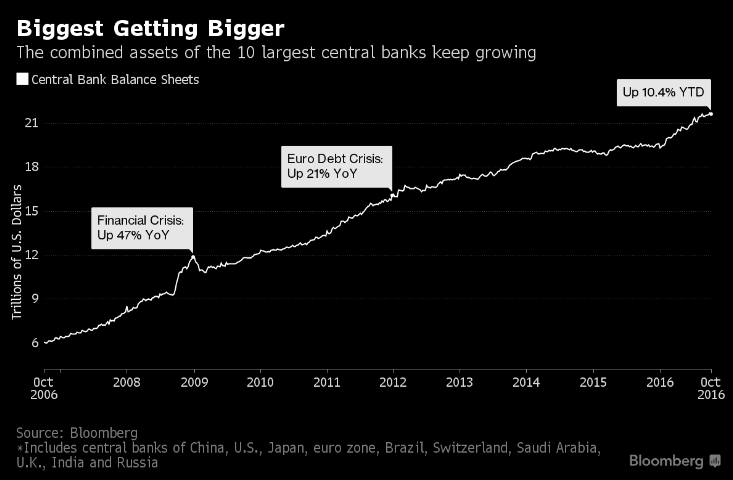 С декабря 2015 года Банк Японии совместно с Европейским центральным банком увеличили свои балансы на 2,1 трлн. долларов, в то время как ФРС и Национальный банк Китая сократили на 2%.