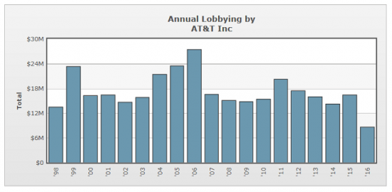 Телекоммуникационная индустрия тесно связана с правительством, неясно, хорошо это или плохо. Это выражается в крупных затратах на лоббирование. AT&T один из крупнейших лоббистов в стране. Это должны учитывать акционеры, поскольку некоторые исследования показывают, что лоббирование может давать хорошую отдачу на капитал. Этические вопросы лоббирования оставим за пределами статьи. На рисунке ниже показаны затраты на лоббирование по годам: