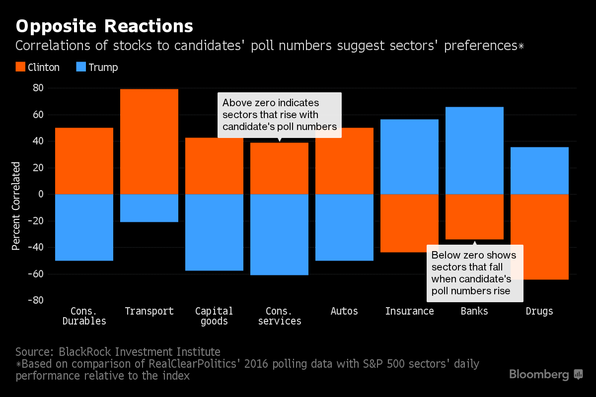 Анализ корреляции котировок акций и результатов опросов, проведенный управляющей компанией BlackRock’s, показал, что под руководством Трампа могут неплохо себя чувствовать производители лекарств, страховщики и банки.