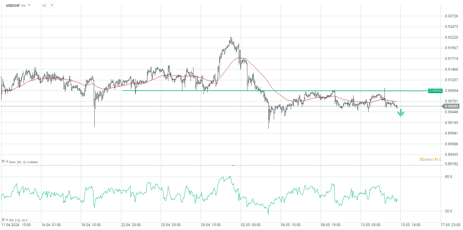 После импульсного пролива вниз валютная пара USDCHF продолжает консолидироваться на своих локальных минимумах и удерживать ближайший зеркальный уровень сопротивления. Реакция на сопротивление в районе 0.9096 указывает на перспективу дальнейшего снижения по данной валютной паре в сторону шортовых импульсов от 1-3 мая с ближайшей целью в районе 0.9000. Удержание цены ниже 50 ЕМА служит тому подтверждением. Исходя из этого, наша рекомендация по USDCHF: шорт ниже зеркального уровня сопротивления 0.9096. Альтернативный сценарий: закрепление выше уровня сопротивления 0.9096 будет означать возможность дальнейшего роста.