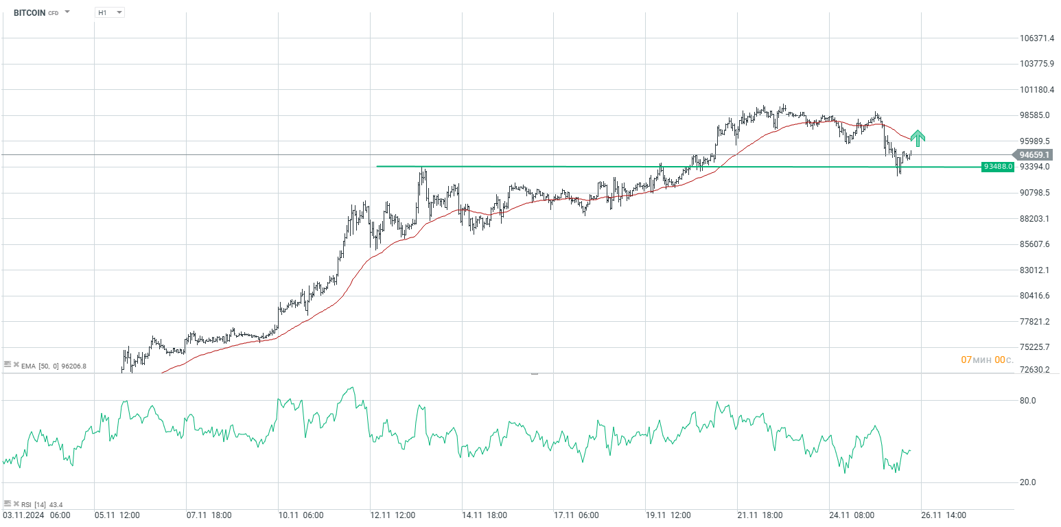 После импульсного трендового роста криптовалюта BITCOIN показала коррекционное снижение до ближайшего зеркального уровня поддержки. Реакция на поддержку в районе 93488 указывает на перспективу продолжения восходящего движения по данному инструменту с целью на пробитие образовавшихся максимумов. Индикатор RSI находится вблизи зоны перепроданности и указывает на возможный отскок наверх. Исходя из этого, наша рекомендация по BITCOIN: покупка выше зеркального уровня поддержки 93488 с ближайшей целью 100К. Альтернативный сценарий: закрепление ниже уровня поддержки 93488 будет означать возможность дальнейшего коррекционного снижения.
