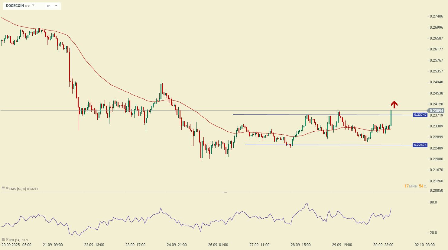 Криптовалюта DOGECOIN, похоже, завершила крупную коррекцию последних торговых недель и готова возобновить трендовый рост. Импульсный выход наверх из бычьего консолидационного прямоугольника с пробитием сопротивления 0.2375 и закреплением выше 50 EMA указывает на перспективу роста в сторону продолжения заходного лонгового движения, которое произошло 26.09. Исходя из этого, наша рекомендация по DOGECOIN: покупка выше локального зеркального уровня поддержки 0.2375, с текущих либо после небольшой коррекции. Ближайшая цель 0.2680. Альтернативный сценарий: закрепление ниже минимума прямоугольника в районе 0.2262 откроет путь для продолжения коррекции вниз.